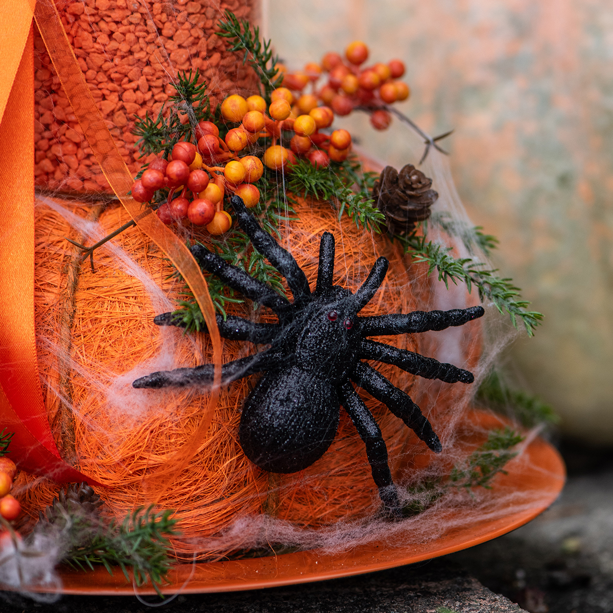 De set bestaat uit 2 spiderfiguren en 1 vleermuisfiguur. De decoratieve dieren gemaakt van plastic zijn bedekt met een zwarte, glinsterende verflaag. Het spinlichaam is ongeveer 6 centimeter lang. Samen met de acht poten is de diameter ongeveer 10 centimeter. De vleermuis met lint heeft een lengte van ongeveer 13 centimeter. Met vleugels heeft de figuur een diameter van ongeveer 14 centimeter.