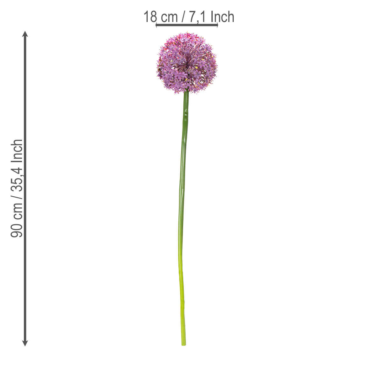 Suchen Sie nach einem echten Hingucker für Ihre Wohn- oder Arbeitsräume? Dann wird Sie unsere Kunstblume Allium begeistern! Diese dekorative Blume vereint pure Eleganz mit zeitloser Schönheit und verleiht jedem Raum einen Hauch von Stil. Mit ihrer beeindruckenden Höhe von 90 cm wird sie zum Highlight auf Sideboards, Tischen oder in hohen Vasen. Besonders ins Auge fällt der kugelförmige, lilafarbene Blütenkopf, der täuschend echt wirkt und durch seine detailgetreue Gestaltung zum Staunen einlädt. Die hochwertige Verarbeitung aus Polyester und Kunststoff sorgt für eine langlebige Qualität und macht diese Zierblume zu einem verlässlichen Dekoelement.