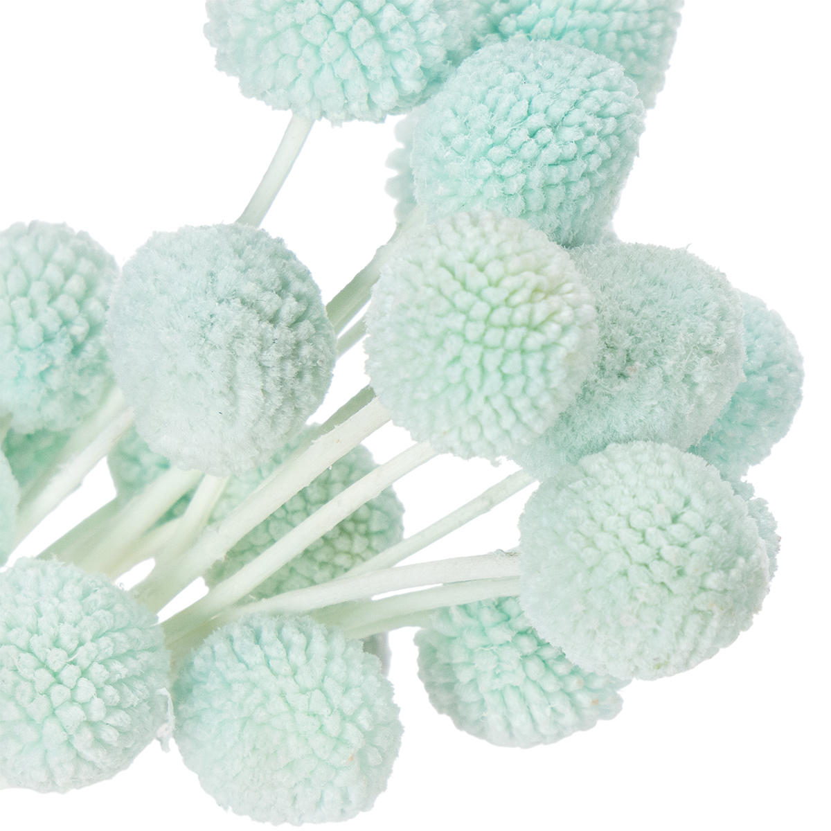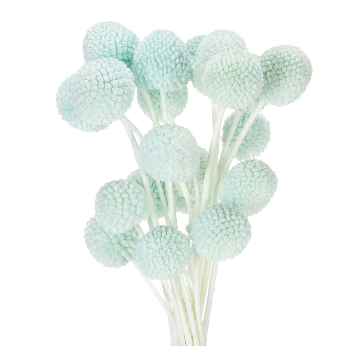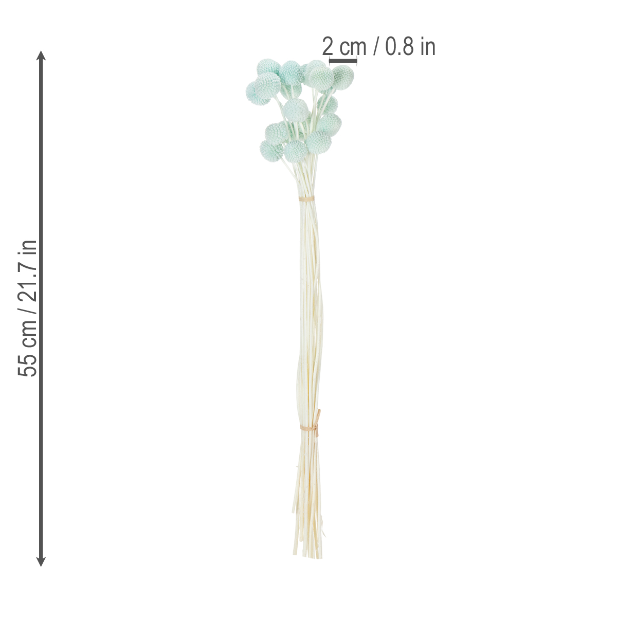 Les fleurs de Craspedia, d'un diamètre de deux à trois centimètres environ, forment un magnifique centre de table. Leurs tiges aux teintes naturelles contrastent avec le bleu menthe éclatant. Ce bouquet est particulièrement décoratif dans des vases minimalistes ou intégré à une composition plus importante de fleurs séchées. On peut l'associer, par exemple, à des herbes de la pampa ou à de l'eucalyptus pour un style aérien et moderne.