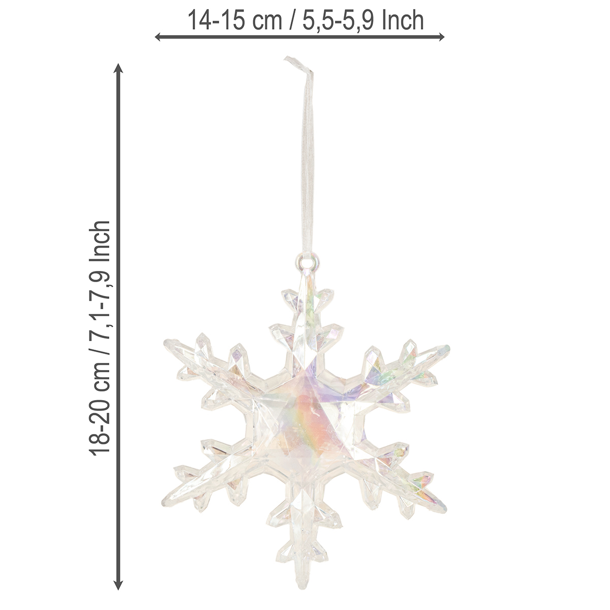 Erleben Sie die Magie des Winters mit unseren irisierenden Deko-Schneeflocken. Diese kunstvoll gestalteten Schneeflocken mit einem Durchmesser von 14-15 cm sind das perfekte Element, um Ihrem Wohnraum eine elegante und winterliche Atmosphäre zu verleihen. Ob als hängende Weihnachtsdeko, als funkelnder Fensterschmuck oder als Highlight für Ihren Christbaum – diese Schneeflocken-Deko zieht garantiert alle Blicke auf sich. Die schimmernden Oberflächen reflektieren das Licht, was Ihrer Dekoration eine bezaubernde Note verleiht. Hergestellt aus hochwertigem Kunststoff, sind sie robust und langlebig, sodass Sie viele Winter Freude an ihnen haben werden.