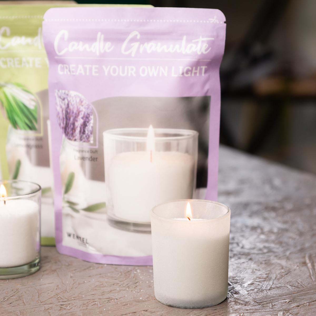 Kreativität und Handarbeit gehen Hand in Hand. Das Wachsgranulat eignet sich perfekt für alle, die Kerzen -Deko selber machen wollen. Schaffen Sie individuelle, duftende Kunstwerke. Jedes Set enthält alles, was Sie benötigen – Kerzensand, einen Docht und einen Dochthalter, um einzigartige Duftkerzen im Glas selber zu machen. Was Sie noch benötigen, ist ein hitzebeständiges Gefäß, am besten natürlich ein Kerzenglas.