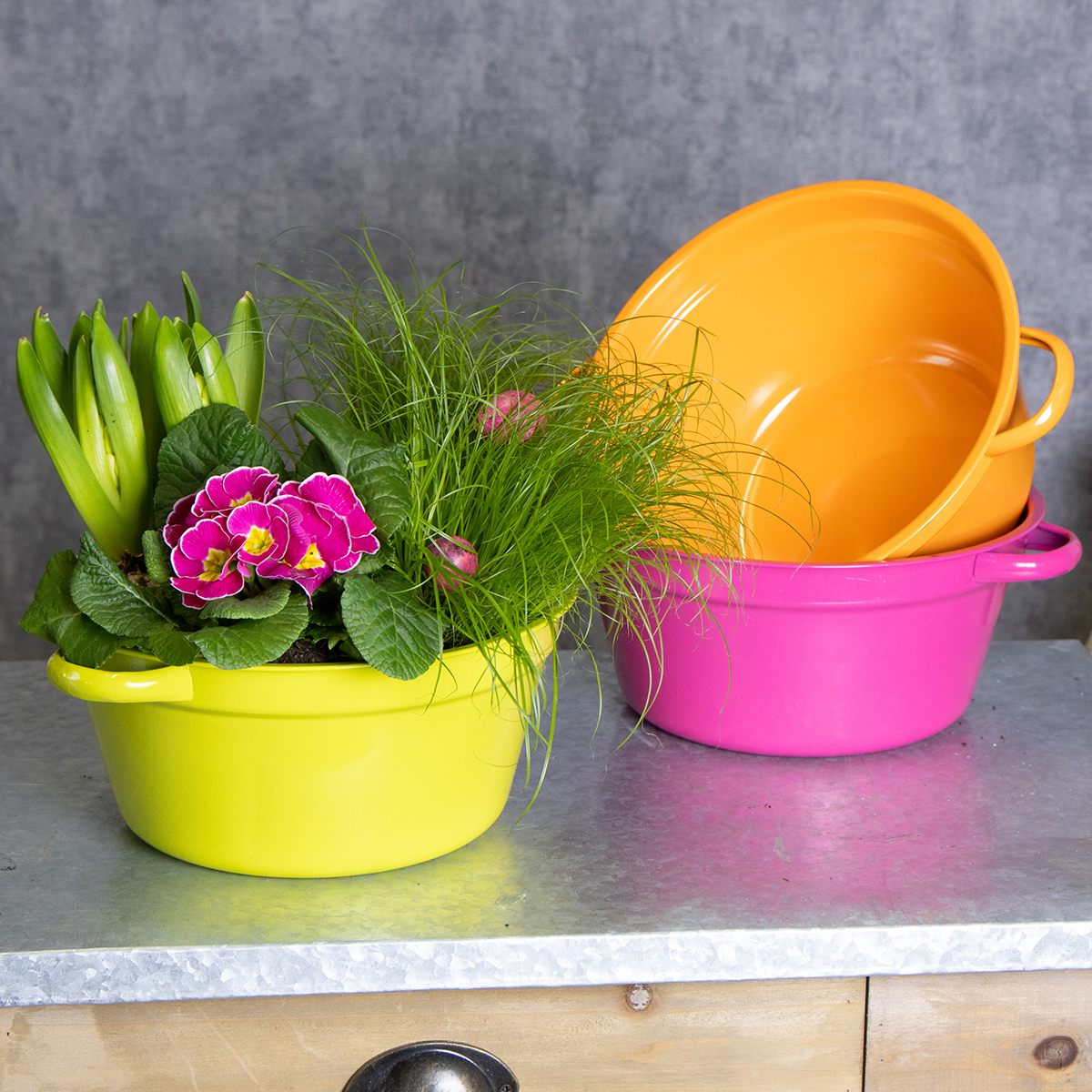 Unsere Pflanzschalen aus Blech kombinieren Funktion und Stil auf charmante Weise. Sie strahlen in den Farben Grün, Orange und Rosa – ein Trio, das sofort gute Laune verbreitet. Mit einem Durchmesser von 25 cm und praktischen Henkeln sind sie leicht zu transportieren und hervorragend für unterschiedlichste Arrangements geeignet. Ob für Ihr Wohnzimmer, die Fensterbank oder den Balkon: In diesen Schalen gestalten Sie mit Leichtigkeit Ihren eigenen kleinen Kräutergarten, hübsche Blumenschalen oder kreative Geschenkideen. Stellen Sie sich vor, wie sie mit bunten Frühjahrsblühern, Sukkulenten oder frischen Kräutern dekoriert werden – einfach toll, oder?