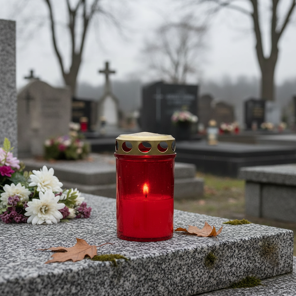 Mit diesem zylindrischen Grablicht in Rot ergänzen Sie eine würdevolle Grabgestaltung und können Grablaternen wieder nachfüllen. Die praktischen Grabkerzen bestehen aus weißem Kerzenwachs, einer roten Kunststoffhülle und sind mit einem goldenen Deckel abgeschlossen, der an den Seiten praktische Luftlöcher besitzt. Dadurch ist die Kerze vor Wind und Wetter geschützt, während Sie zeitgleich das Grabmal friedlich beleuchtet. Sie haben auch die Möglichkeit, die Grablichter in ein Trauergesteck einzuarbeiten, um einen Gedenkgottesdienst entsprechend zu gestalten.