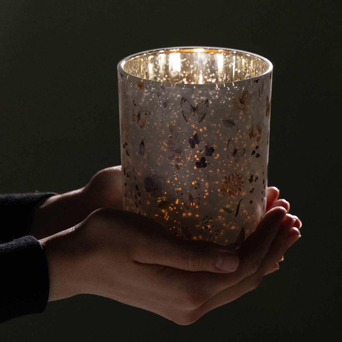 Deze kaarsenhouder is een echte blikvanger. Met een hoogte van 8 cm en een diameter van 7 cm heeft hij precies de juiste afmetingen om een zacht licht te verspreiden zonder te overheersen. Het delicate vlindermotief op het glas, gecombineerd met het zilverkleurige, reflecterende oppervlak aan de binnenkant, zorgt voor een magisch spel van licht en schaduw wanneer er een kaars in brandt. Hij voegt een vleugje elegantie toe aan zowel binnen- als buitenruimtes.