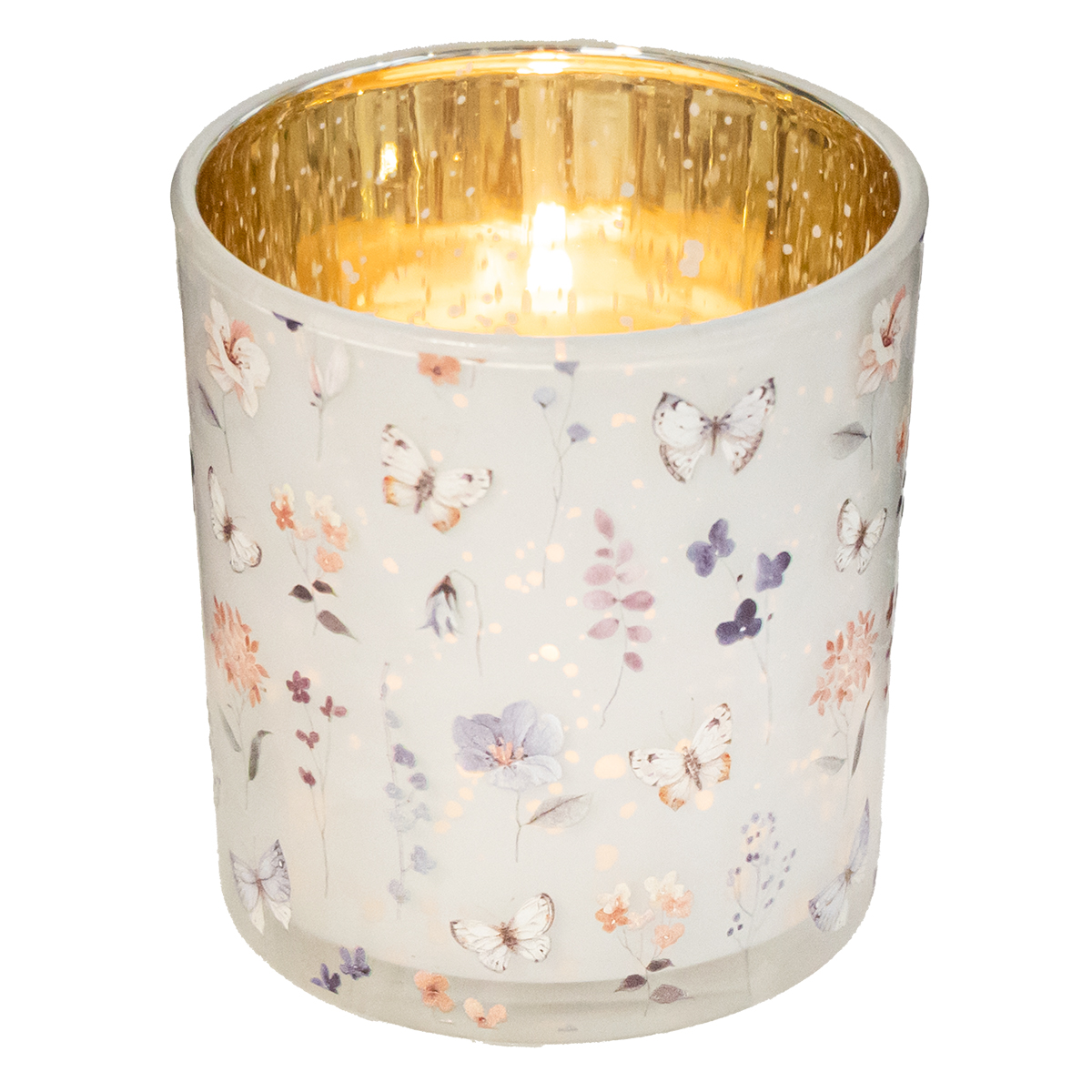 Deze kaarsenhouder is een echte blikvanger. Met een hoogte van 8 cm en een diameter van 7 cm heeft hij precies de juiste afmetingen om een zacht licht te verspreiden zonder te overheersen. Het delicate vlindermotief op het glas, gecombineerd met het zilverkleurige, reflecterende oppervlak aan de binnenkant, zorgt voor een magisch spel van licht en schaduw wanneer er een kaars in brandt. Hij voegt een vleugje elegantie toe aan zowel binnen- als buitenruimtes.