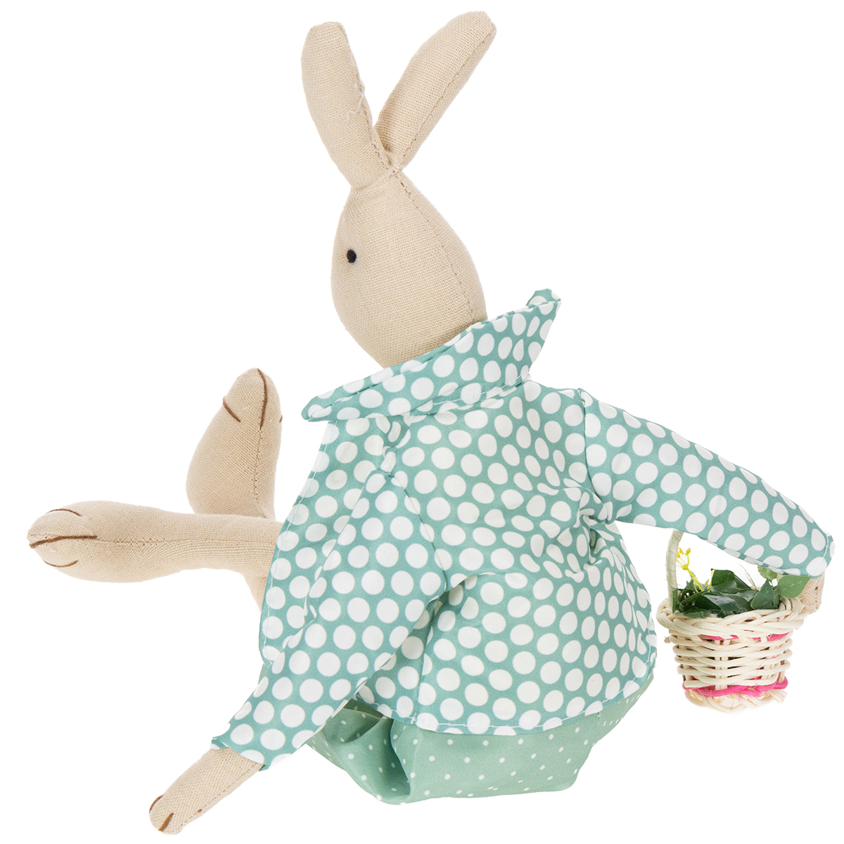 Ce lapin a été fabriqué à la main avec une grande attention aux détails. Le lapin était en tissu naturel et vêtu d'une chemise jaune à pois blancs et boutons en bois, d'un pantalon et d'une veste assortie en turquoise, également avec un motif à pois. Le lapin de Pâques porte un simple nœud en papier autour du cou. L'homme aux lapins a apporté un petit panier de fleurs planté.