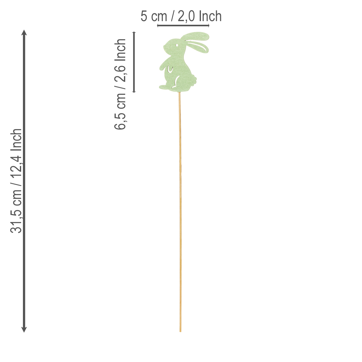 Mit einer Höhe von 31,5 cm und einer Breite von 5 cm sind die Hasen schön sichtbar und gleichzeitig dezent genug, um andere Dekoelemente nicht zu verdrängen. Sie eignen sich für Frühlingsfeste, als Tischdekoration bei Ostern oder als kreative Ergänzung in dekorationsträchtigen Pflanzgefäßen. Ihre zarten Farben harmonieren wunderbar mit Grünpflanzen, frischen Frühlingsblüten oder pastellfarbenem Geschirr.