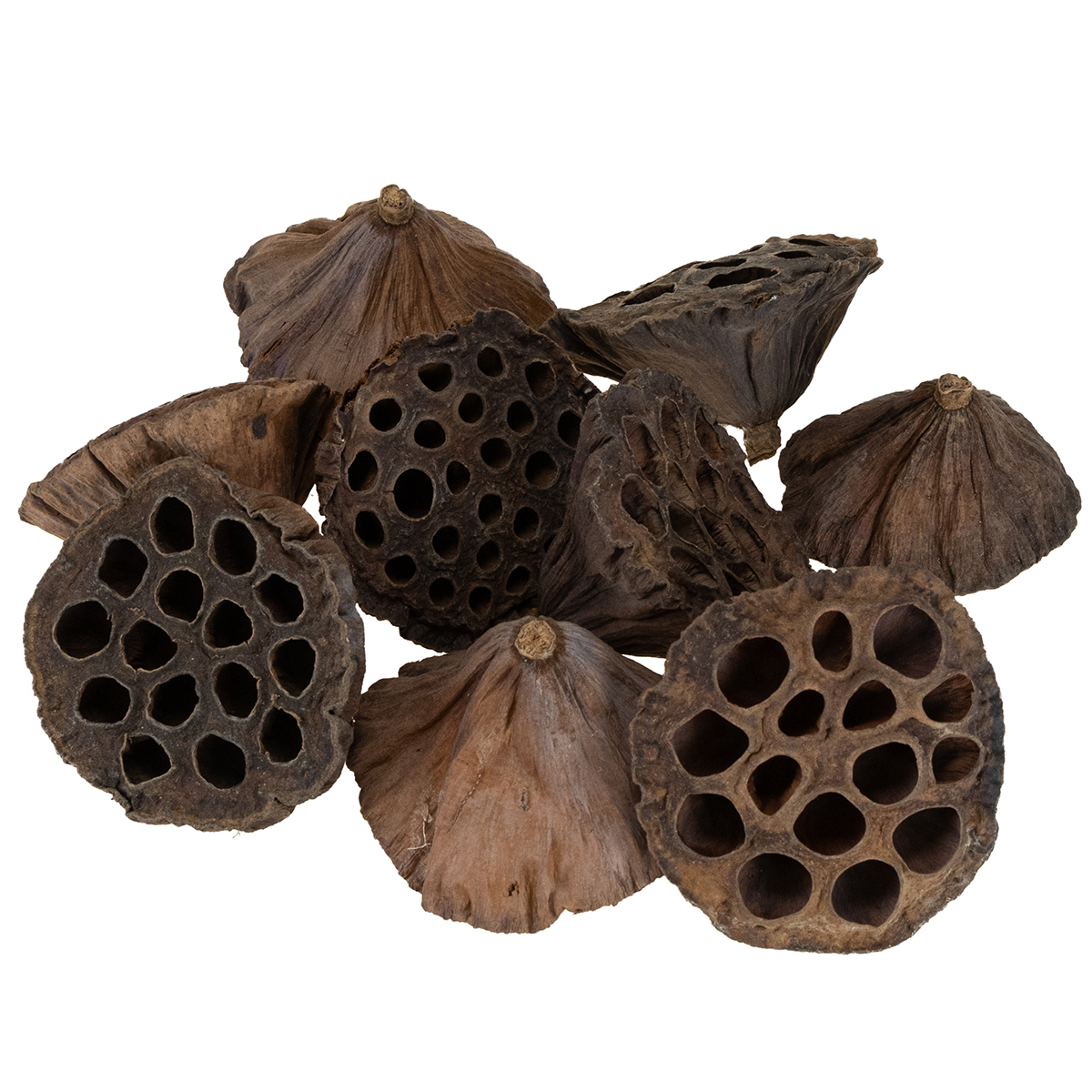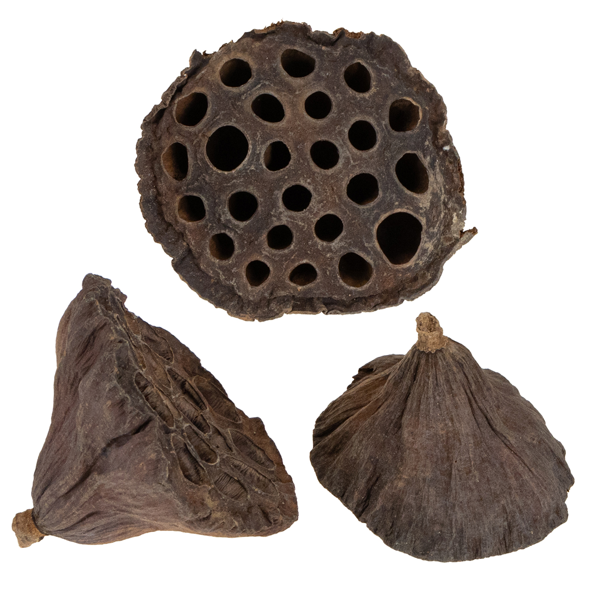 Nos fruits de lotus séchés de couleur naturelle sont conditionnés et vendus par 100 dans un sachet plastique et affichent différentes tailles. Le diamètre des capsules peut donc atteindre 5 à 9 cm et leur taille varie entre 4 et 6 cm.
