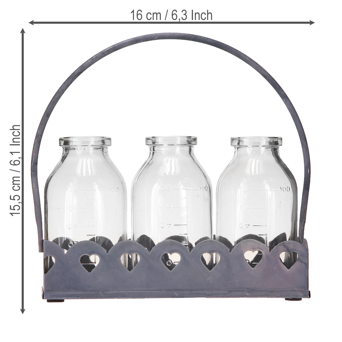 Découvrez l'attrait magique des décorations de mini bouteilles comme des vases sur un plateau. Ces charmantes bouteilles décoratives sont parfaites pour ajouter une touche de nostalgie à votre espace de vie. Chacun des trois vases en verre rappelle les flacons d'apothicaire anciens et est placé sur un plateau en métal gris robuste avec des motifs de cœur perforés. Ce détail de style rétro ajoute une touche romantique à l'arrangement, le rendant idéal pour les décorations de mariage, les décorations de table chaleureuses ou comme idée cadeau. Les dimensions des bouteilles ouvrent une variété d'utilisations, de la plantation rapide de petites compositions florales au stockage d'herbes ou de matériaux d'artisanat.