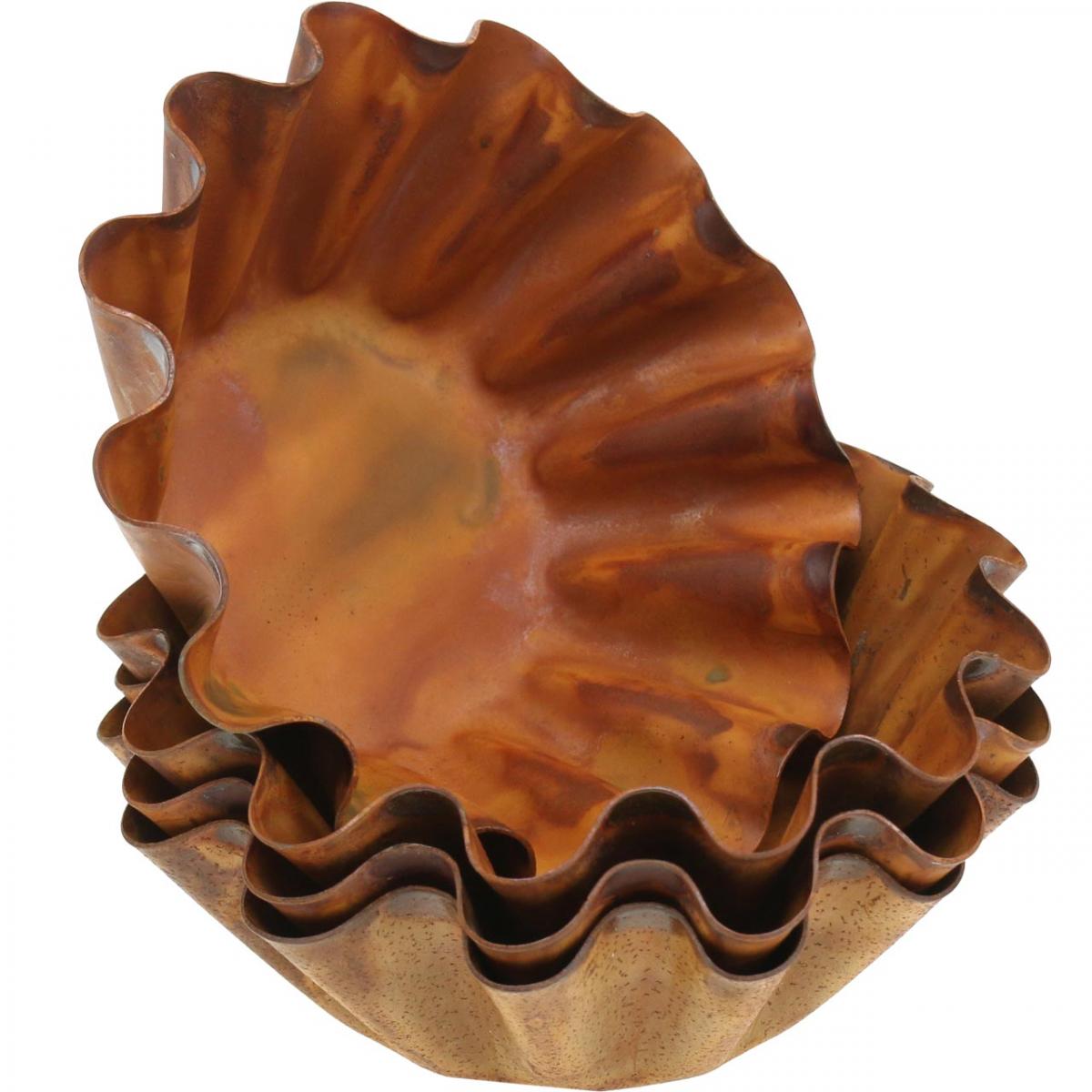 Deze kleine taartvorm is heerlijk geschikt als kandelaar! Plaats een theelichtje op de metalen plaat in de oranjerode patina en de decoratieve bakvorm brengt kaarslicht in je tafeldecoratie.Of het nu gaat om gloeiende kaarsdecoratie in de advent of als originele decoratie in de stijl van een patissier, de metalen decoratie in de vorm van koekjesvormen, gevuld met kunstmatige cakes en muffins of als bloemdecoratie beplant met vetplanten of kleine arrangementen - de rustieke metalen bakvormen worden overal het hoogtepunt van de decoratie - Arrangementen!