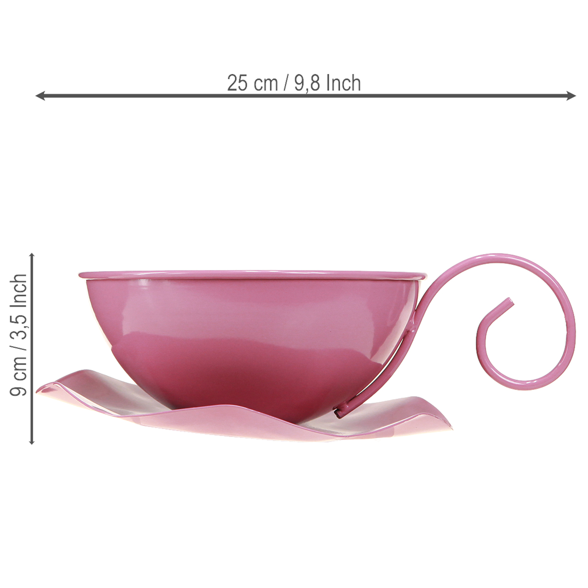 Onze decoratieve beker in roze is een echt hoogtepunt voor elk huis. Met een diameter van circa 16 cm en een hoogte van circa 9 cm is de metalen beker geschikt voor zowel decoratieve als functionele toepassingen. Het pastelroze geschilderde oppervlak trekt ieders aandacht en zorgt voor een vrolijke, uitnodigende sfeer. Het gebogen handvat en de bloemvormige schotel geven het kopje een speelse, maar toch moderne touch. Dankzij de bevestiging van het kopje aan het schoteltje is deze metalen decoratie perfect om te presenteren op een feesttafel of op de vensterbank.