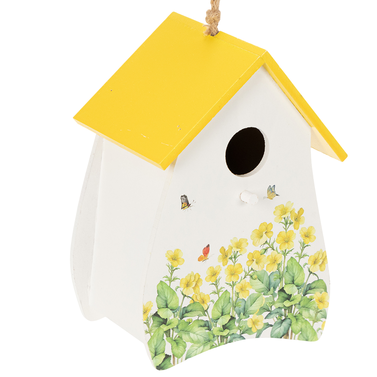 Was sorgt für frischen Wind in der Inneneinrichtung und verleiht Ihrem Zuhause das gewisse Etwas? Genau, eine Deko, die ins Auge sticht! Dieses Vogelhaus in strahlendem Weiß mit gelbem Dach und zarten Blumenmotiven bringt sofort gute Laune und einen Hauch von Frühling in Ihre vier Wände. Perfekt für Fensterbänke, Wohnzimmer oder den Balkon. Es ist nicht nur charmant, sondern auch wunderbar vielseitig einsetzbar, um Ihrem Wohnraum einen liebevollen Akzent zu verleihen. Die robuste Kordel macht das Aufhängen kinderleicht, und wer gerne umdekoriert, wird sich über die praktische Öffnung auf der Rückseite freuen. Holen Sie sich dieses kleine Schmuckstück und lassen Sie es zum Highlight Ihrer Innendeko werden!
