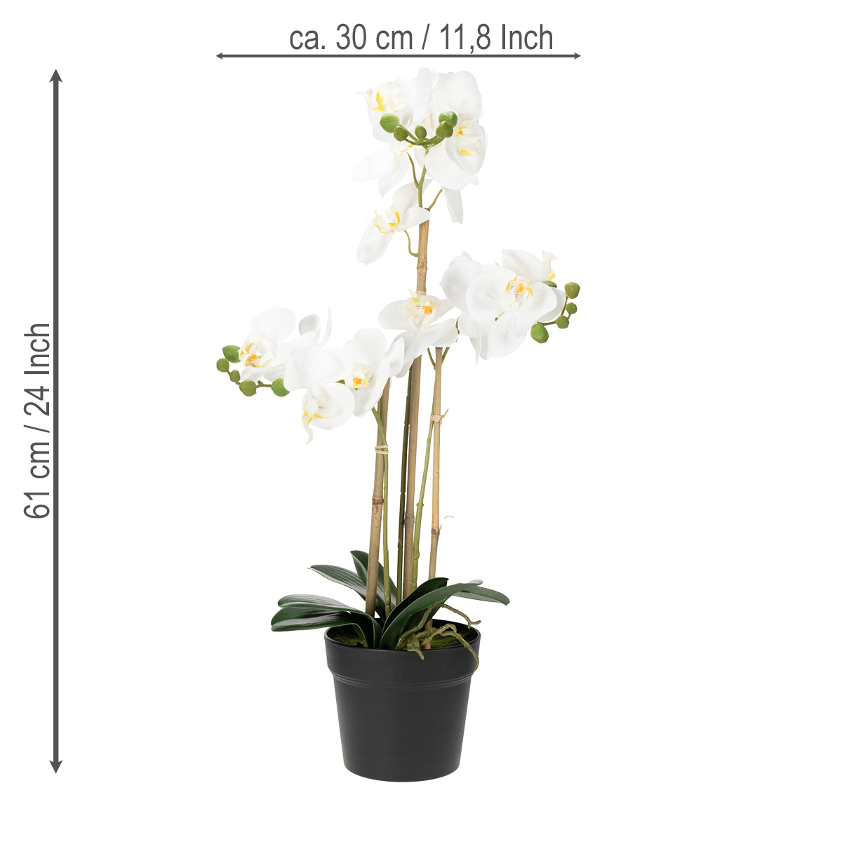 Met onze hoogwaardige kunstorchidee voegt u eenvoudig een vleugje stijl toe aan uw interieur. Het arrangement bestaat uit drie elegante witte bloemstelen met kleine groene knopjes. Alles staat stevig in een zwarte pot die discreet in elk interieur past. De kunstbloem is gemaakt van zorgvuldig vervaardigde stof en kunststof, waardoor hij er niet alleen levensecht uitziet, maar ook duurzaam is. Met een breedte en diameter van circa 25 cm past hij perfect in woonkamers, kantoren of stijlvolle ontvangsthallen.