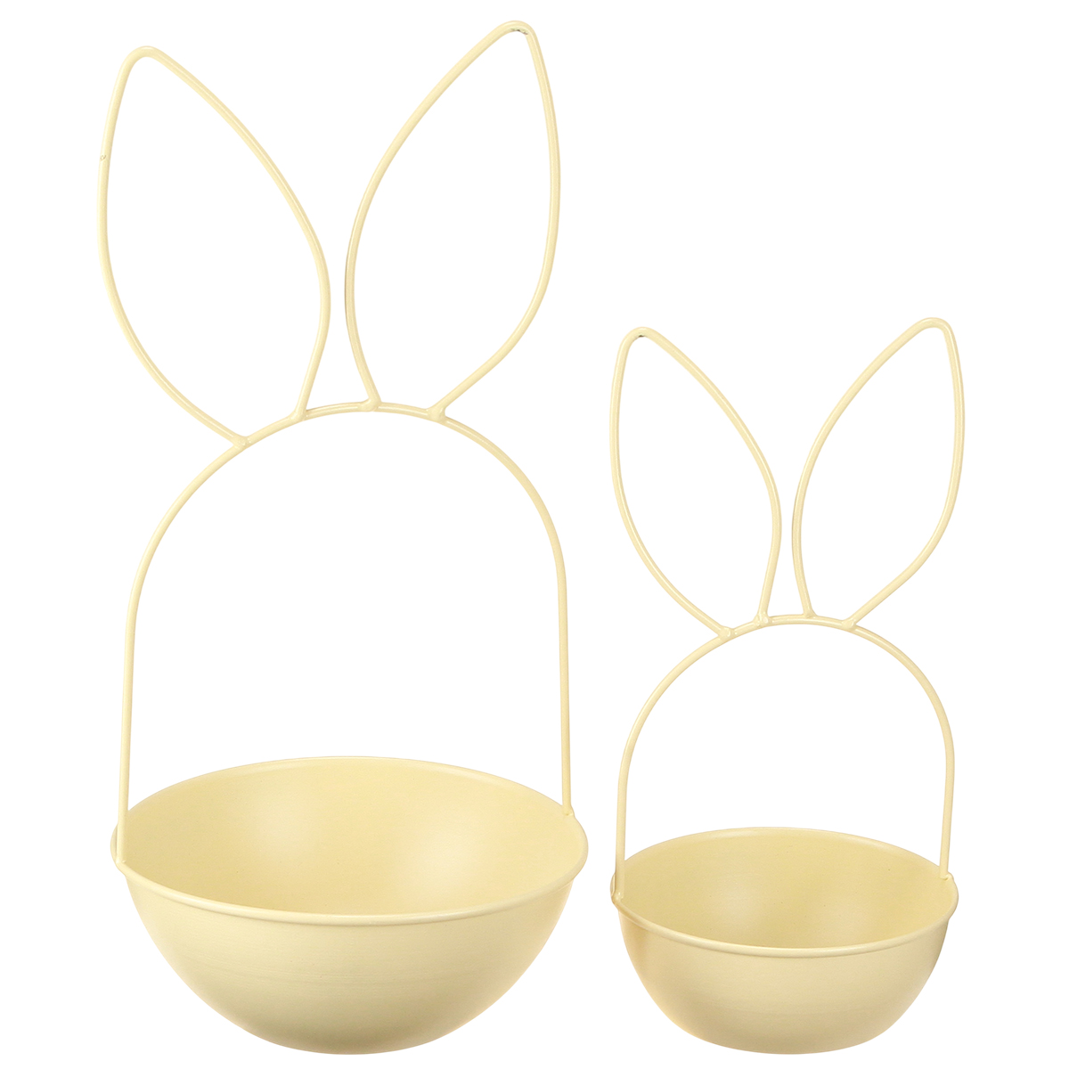 Deze paasmand in een frisse gele tint, gemaakt van stevig metaal, is een waar juweeltje onder de paasdecoraties. Met zijn kenmerkende konijnenoortjes combineert hij een eigentijds design met de lichtheid van de lente. De set bestaat uit twee manden in verschillende maten – perfect op elkaar afgestemd voor een harmonieus geheel. De vloeiende, strakke lijnen en het delicate ontwerp van de oortjes maken deze manden tot veelzijdige decoratieve accessoires die naadloos passen in diverse interieurstijlen: van klassiek landelijk tot modern minimalisme.