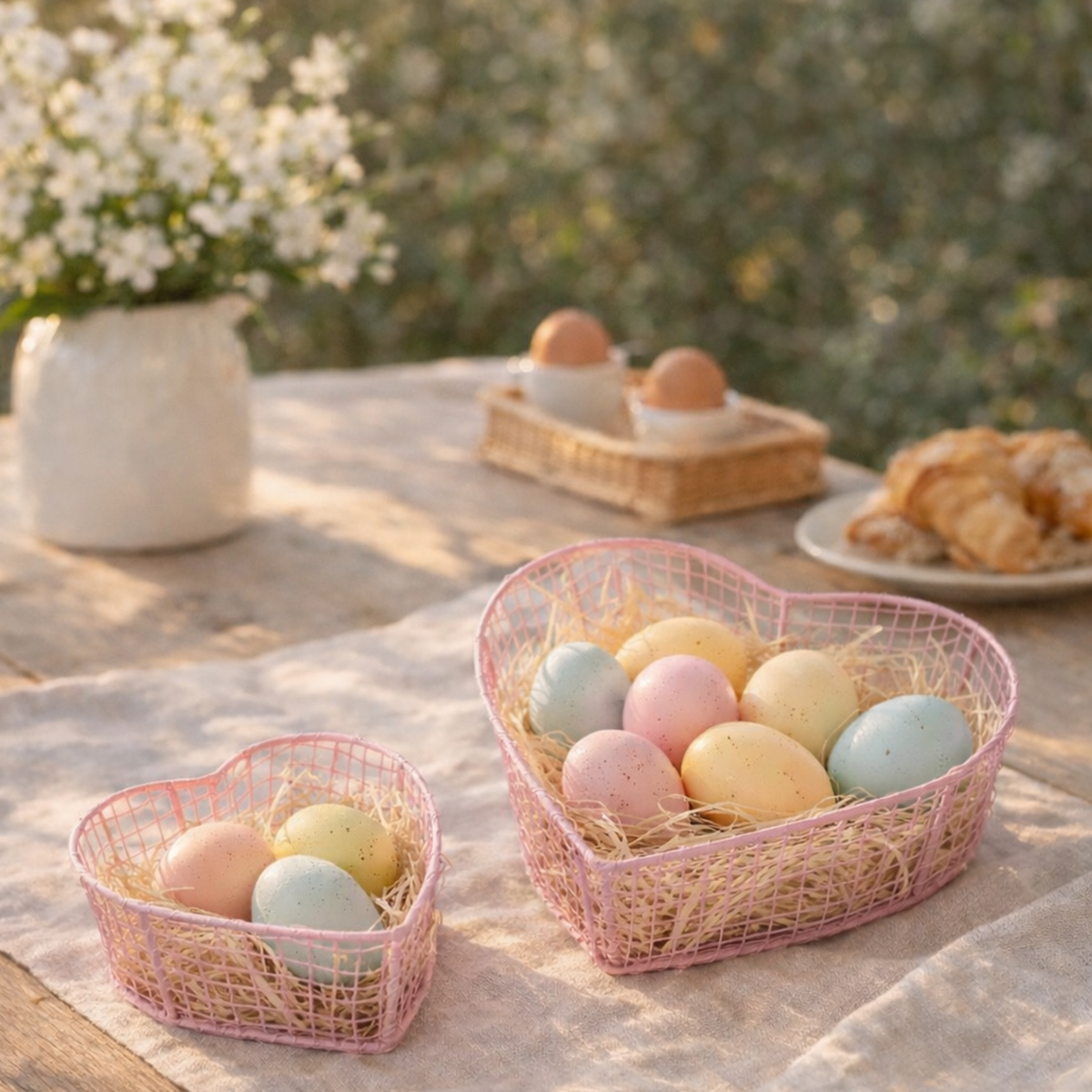 Creëer een romantische maar toch georganiseerde sfeer met deze prachtige hartvormige draadmanden. Of ze nu gebruikt worden als decoratie op tafel, voor het opbergen van kleine spullen of als stijlvolle cadeauset, deze hartvormige metalen manden brengen liefde en orde in huis. De stevige metalen manden zijn verkrijgbaar in zachte roze en paarse tinten. Ze zijn perfect voor gebruik in de woonkamer of beschutte buitenruimtes en de ideale keuze voor romantische tafeldecoraties bij speciale gelegenheden zoals bruiloften, Valentijnsdag of verjaardagen.