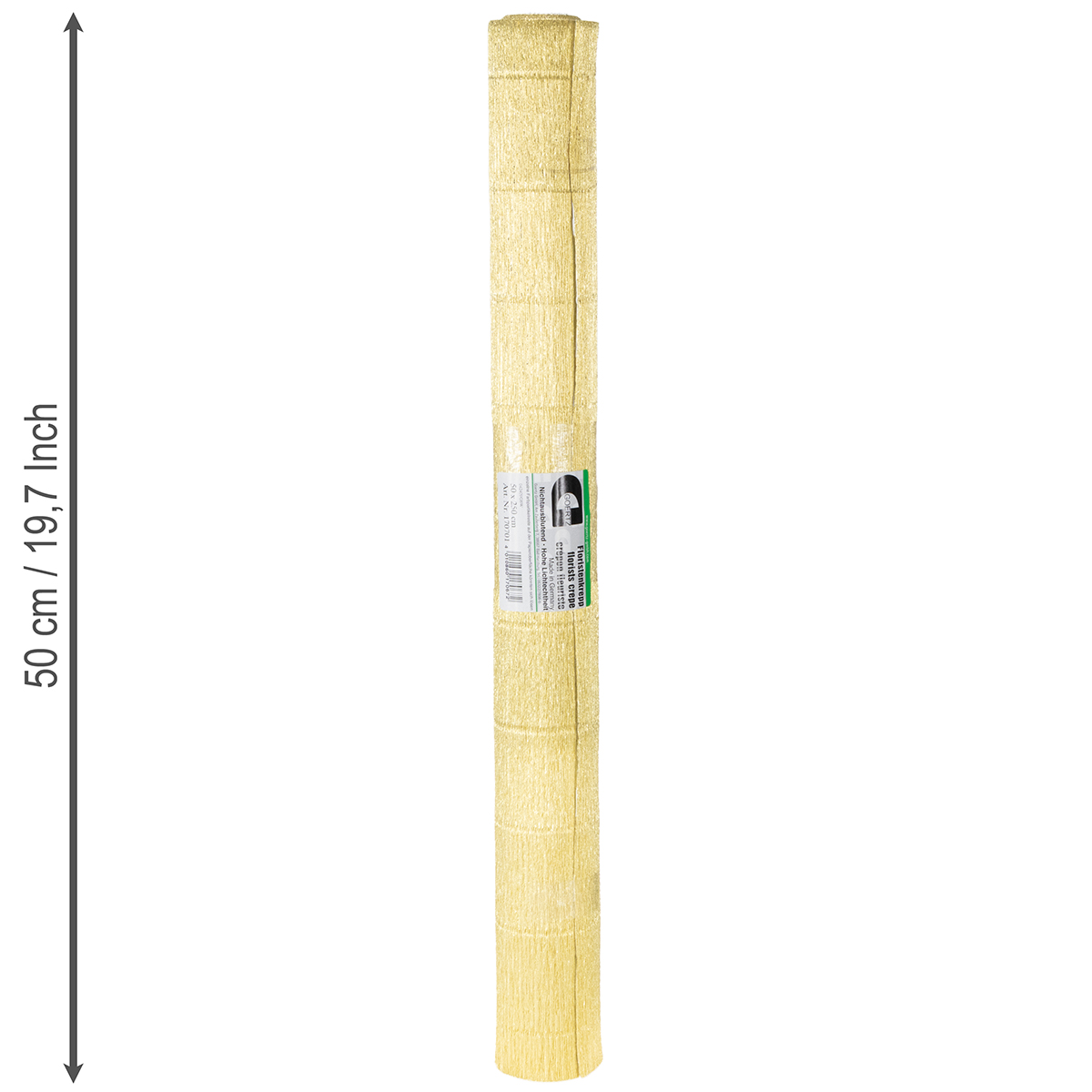 Das Floristen-Krepppapier in Gold ist zu einer Rolle aufgewickelt und besitzt eine weiße Innenseite. Mit einer Größe von circa 50 x 250 Zentimeter können Sie sowohl große als auch kleine Dekorationen veredeln.