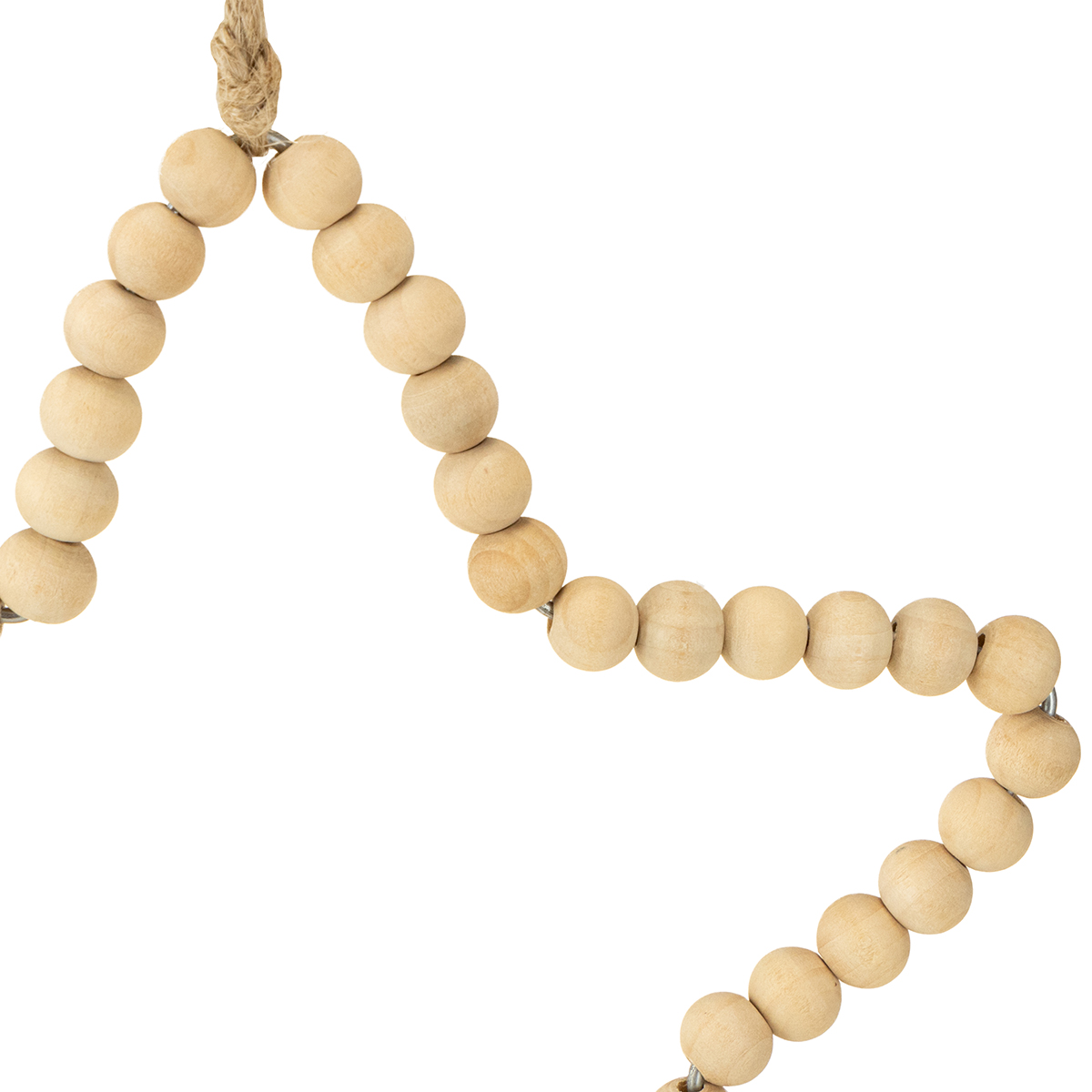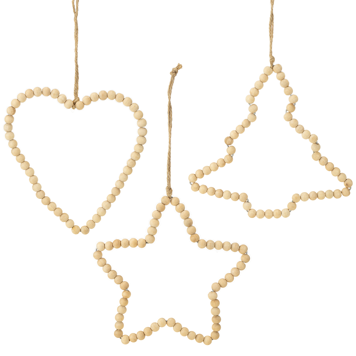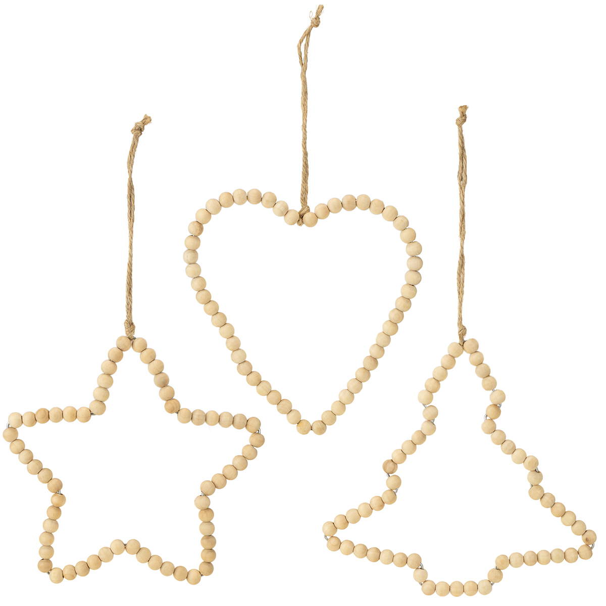 Een hart, een ster, een kerstboom - voor welk festival worden deze decoratieve hangers gebruikt? Natuurlijk voor kerst! Deze drie accessoires zitten in één set. De deco hangers zijn gemaakt van stevig metaaldraad met daarop houten kralen geregen. Het metaal geeft de kersthanger zijn vorm, terwijl de houten kralen hem een mooie, natuurlijke uitstraling geven.De parels zijn ongeveer een centimeter in doorsnee. De hanger bestaat uit een koord, ook naturel gehouden. De decoratie is uitstekend geschikt als kerstboomversiering, maar ook als hangende decoratie of raamdecoratie. Want de kersthanger ziet er van alle kanten even goed uit dankzij de ronde houten kralen.