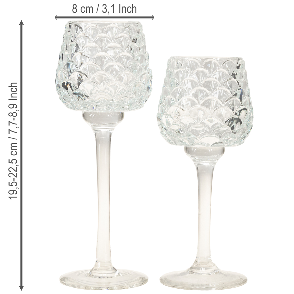 Ideal als stilvolle Wohnzimmerdekoration oder als Statement-Piece bei besonderen Anlässen wie Hochzeiten, Geburtstagsfeiern oder festlichem Dinner. Aber auch im Alltag sorgen diese Glasteelichthalter für ein warmes und einladendes Ambiente. Besonders stimmungsvoll wirken sie in Kombination mit weiteren Glas-Accessoires. Ein schlicht gehaltener Tisch, etwas Tannengrün – und schon entsteht ein dekoratives Ensemble, das sich sehen lassen kann.