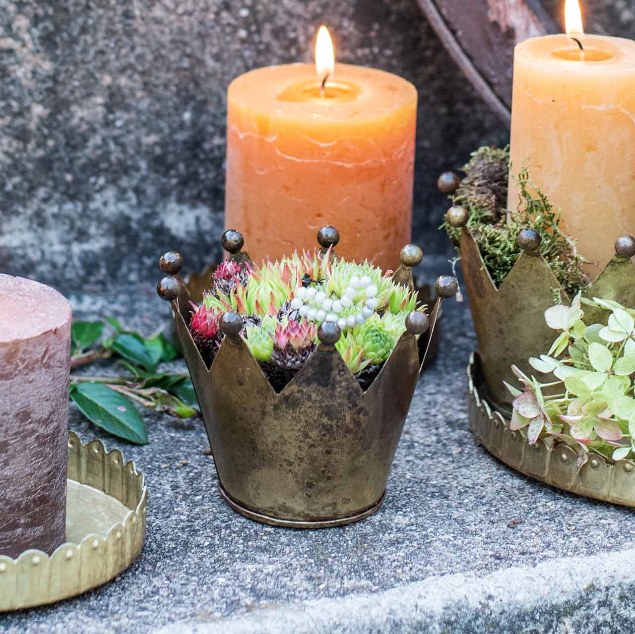 Daarom past de kleine metalen decoratie perfect in de kerstdecoratie of je koperen kandelaars. Zet een theelichtje in de kroon in goud of gebruik de decoratieve kroon als kleine plantenbak, bijvoorbeeld voor vetplanten. Een LED-theelichtje of een mini-arrangement ziet er ook betoverend uit in de messing kroon. Voor een kleine decoratie voor de kerst, met folie als plantenpot of als decoratie voor de advent met de grotere metalen kroon in dezelfde stijl, je vindt altijd wel een toepassing voor de kroon.