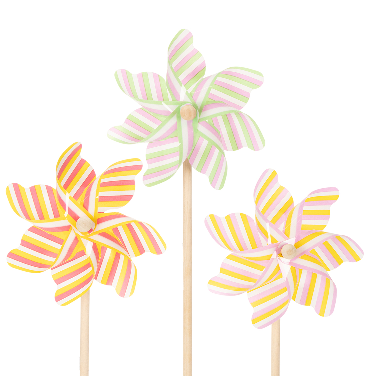 - Ensemble composé de 3 moulins à vent rayés aux délicates couleurs pastel