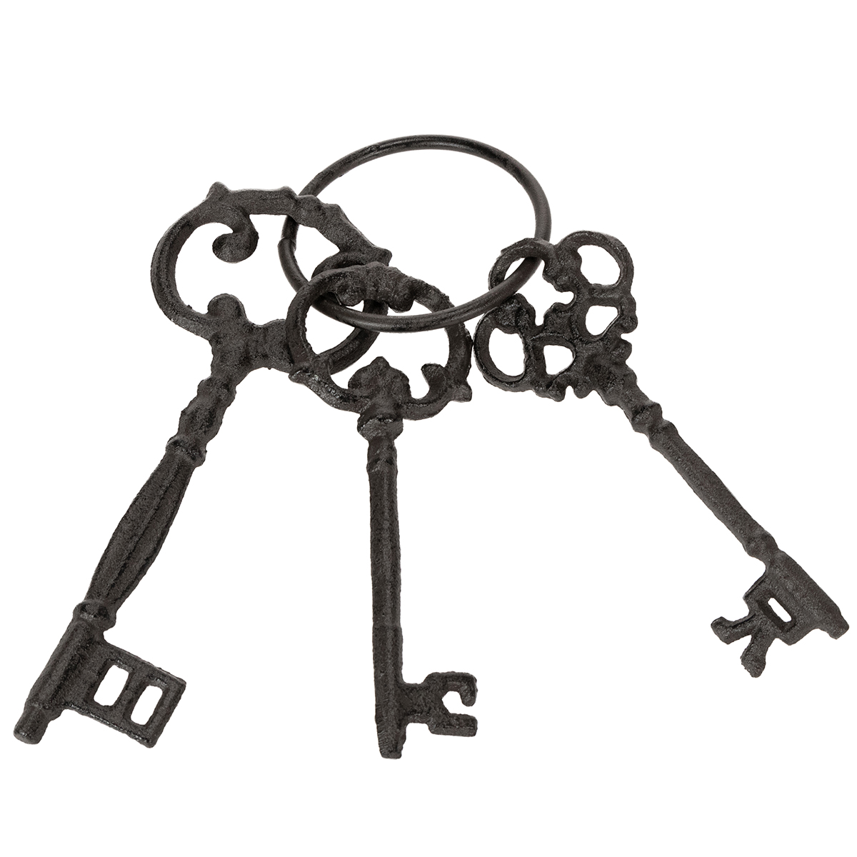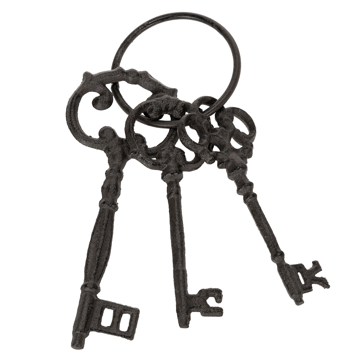 - Ontwerp: drie verschillende sleutels in vormen die doen denken aan antieke modellen, bevestigd aan een ring.
