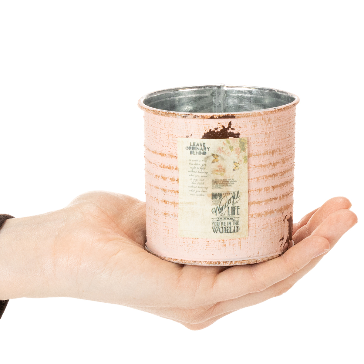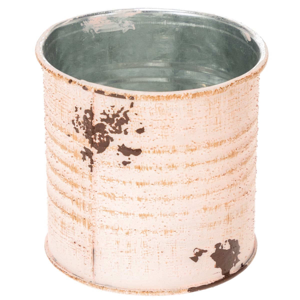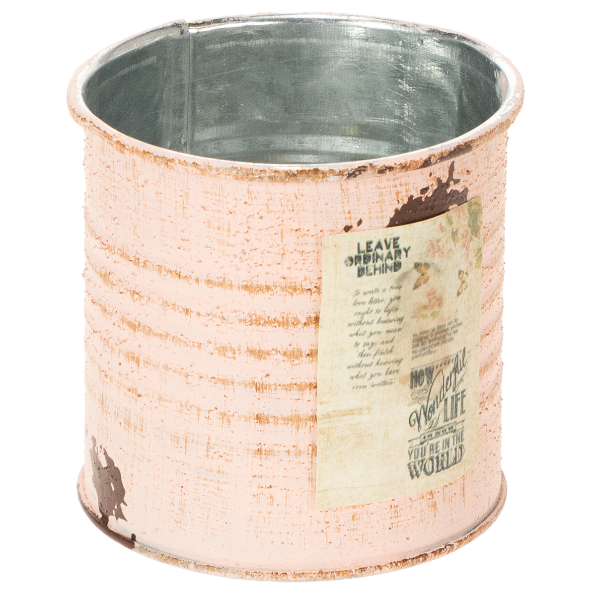 Als bloempot is de sierdoos in de zalmkleurige uitvoering gegarandeerd een blikvanger! Het kleine blikje van metaal is aan de binnenkant zilver gespoten en aan de buitenkant two-tone met vintage verf. Kleine details zoals een nostalgisch etiket en geschilderde roestvlekken maken van de metalen pot een oud ogend decoratief object.