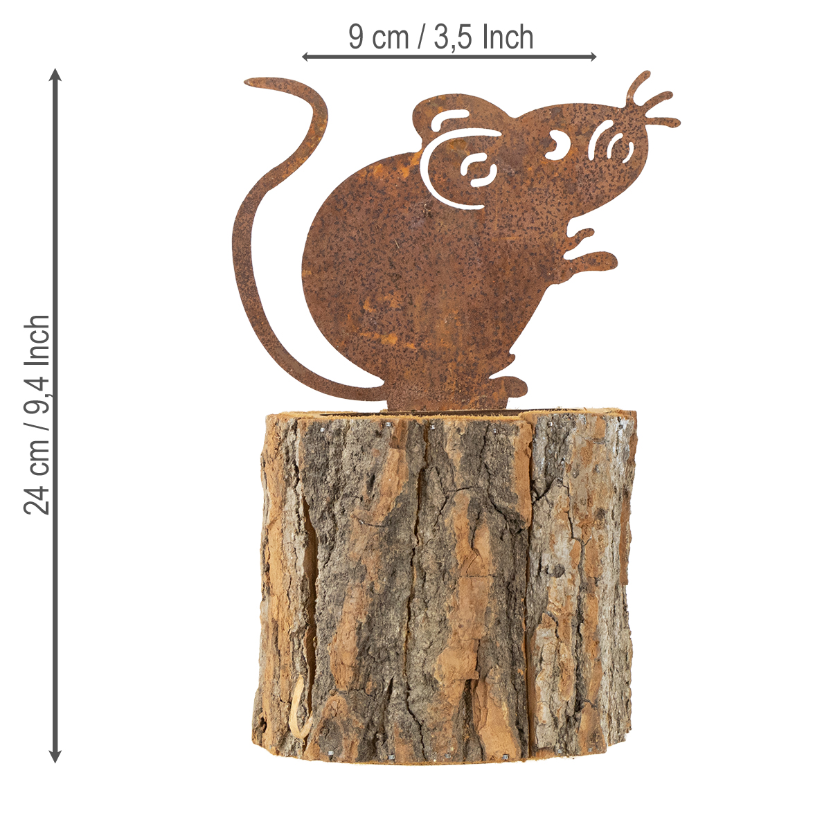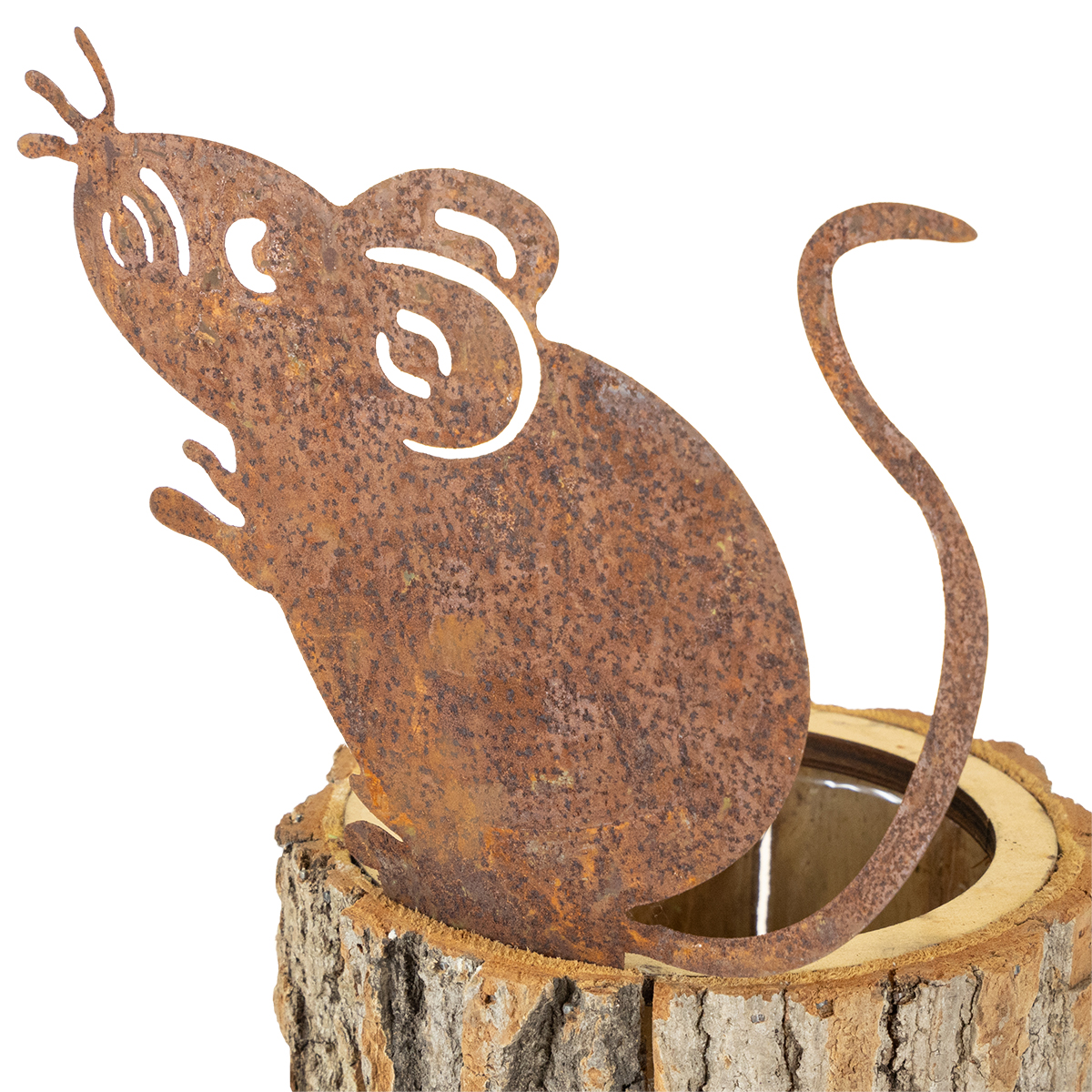 Was wie ein kleiner Baumstamm aussieht, ist ein Blumentopf aus Holz. Der Übertopf wird aus Rinde zusammengesetzt. Auf dem Rand sitzt eine Maus aus Metall, die mit einer wundervollen Patina aus Edelrost überzogen ist.Die Öffnung oben besteht aus einem Holzring, durch den sich verschiedene Pflanzen einsetzen lassen. Dieser Blumentopf aus Holz eignet sich vor allem für Kräuter und andere kleine Gewächse, aber auch für herbstliche Trockengestecke. Ein Plastikeinsatz im Inneren des Pflanzgefäßes sorgt dafür, dass das Holz vor der Feuchtigkeit in Blumenerde geschützt ist.