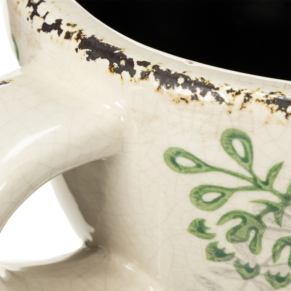 Zoekt u een charmante manier om uw kamerplanten stijlvol te presenteren? Deze keramische plantenpot met bloemenpatroon geeft uw vensterbank een frisse uitstraling! Met zijn zachtwitte basis en delicate groene plantmotieven combineert deze rustieke pot klassieke esthetiek met een vleugje vintage charme. Of u hem nu gebruikt als decoratieve pot voor uw favoriete vensterbank, als creatieve pennenhouder voor op uw bureau of zelfs als originele opbergoplossing voor de badkamer, dit veelzijdige accessoire past zich moeiteloos aan uw behoeften aan.