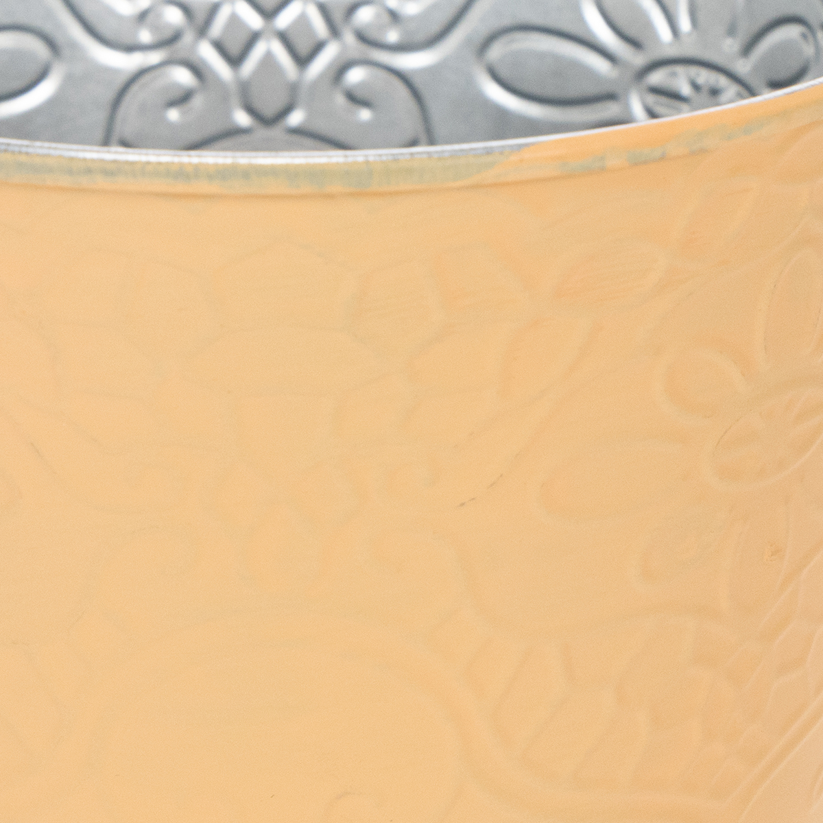 Le motif rétro fleuri avec des fleurs ressort merveilleusement en trois dimensions grâce au gaufrage sur le pot en métal. Cet effet est encore renforcé par l'application légèrement inégale de la peinture sur le pot de fleurs : des coups de pinceau individuels de couleur pastel sont visibles sur la décoration en métal.