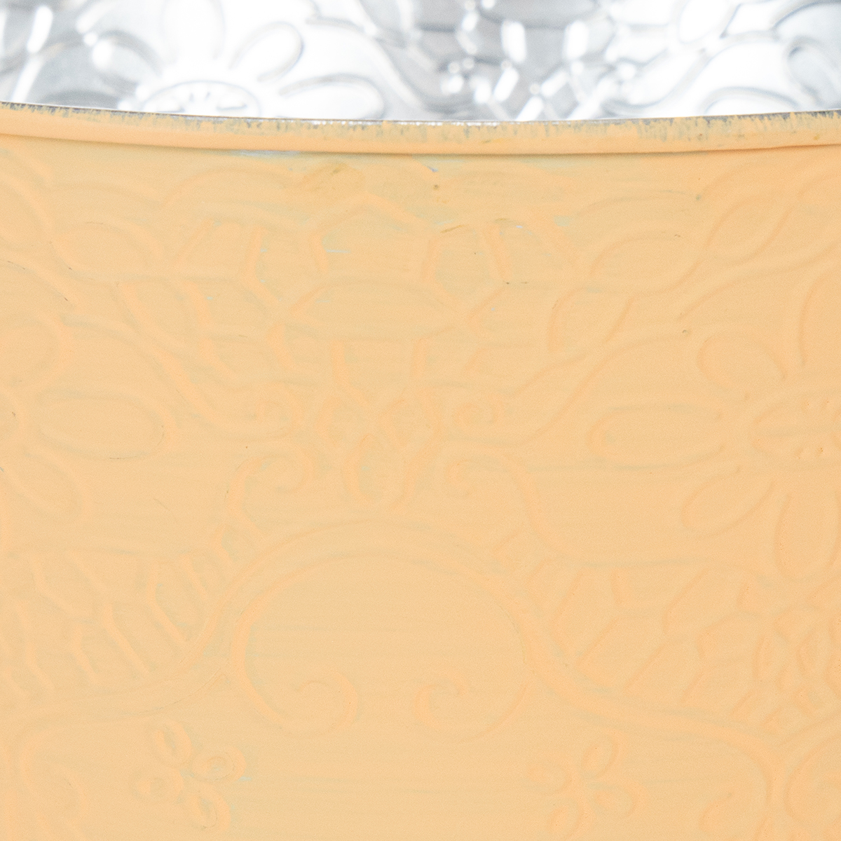 Les fleurs et les vrilles en relief donnent au pot de fleurs un superbe look vintage. L'extérieur plaît avec la couleur pastel tendance orange appliquée avec des coups de pinceau visibles.