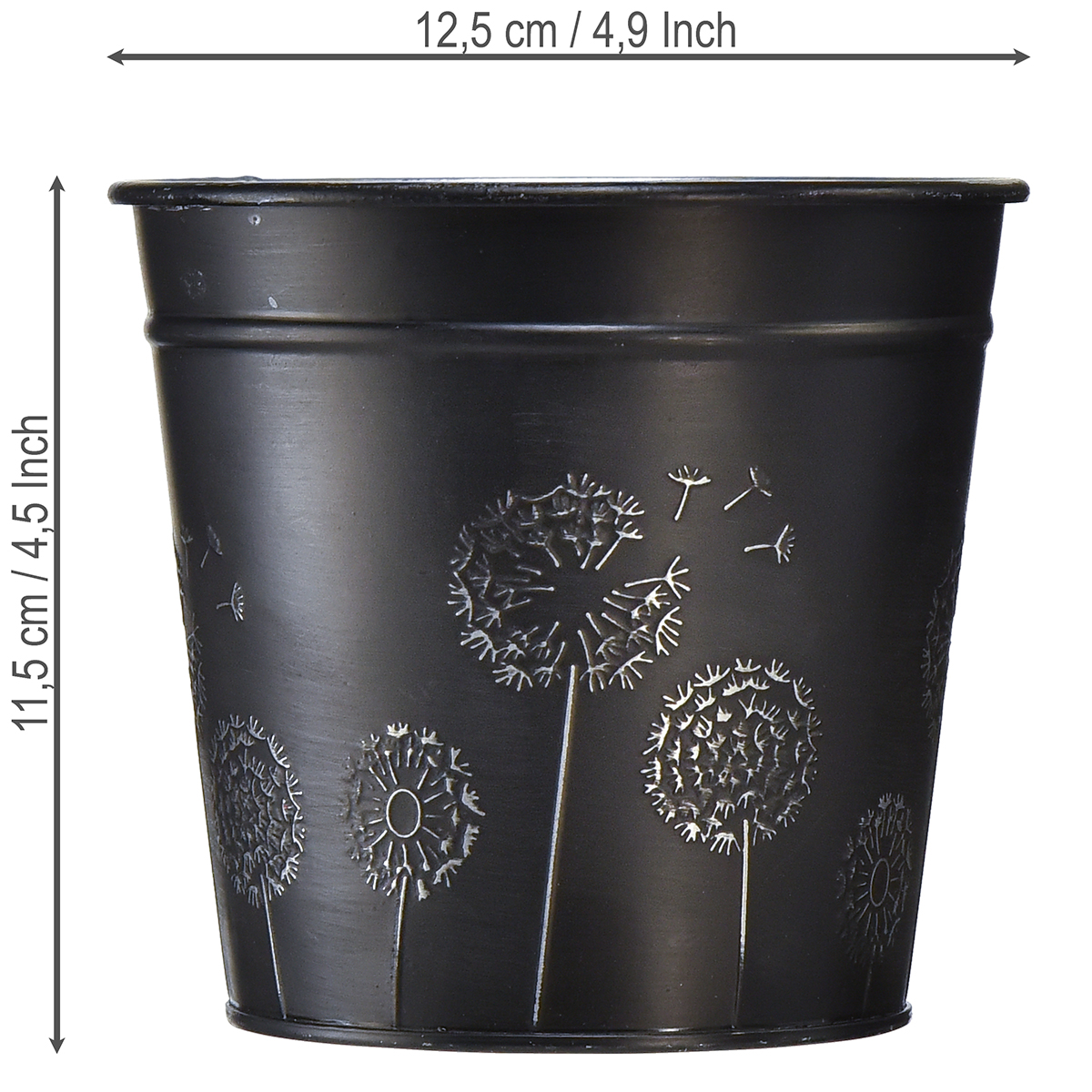 Ce pot de fleur noir présente une décoration argentée qui vous donne une impression d'été. Les pissenlits sont disponibles en différentes tailles et stades. Et certains parapluies s’envolent déjà vers de nouvelles destinations.