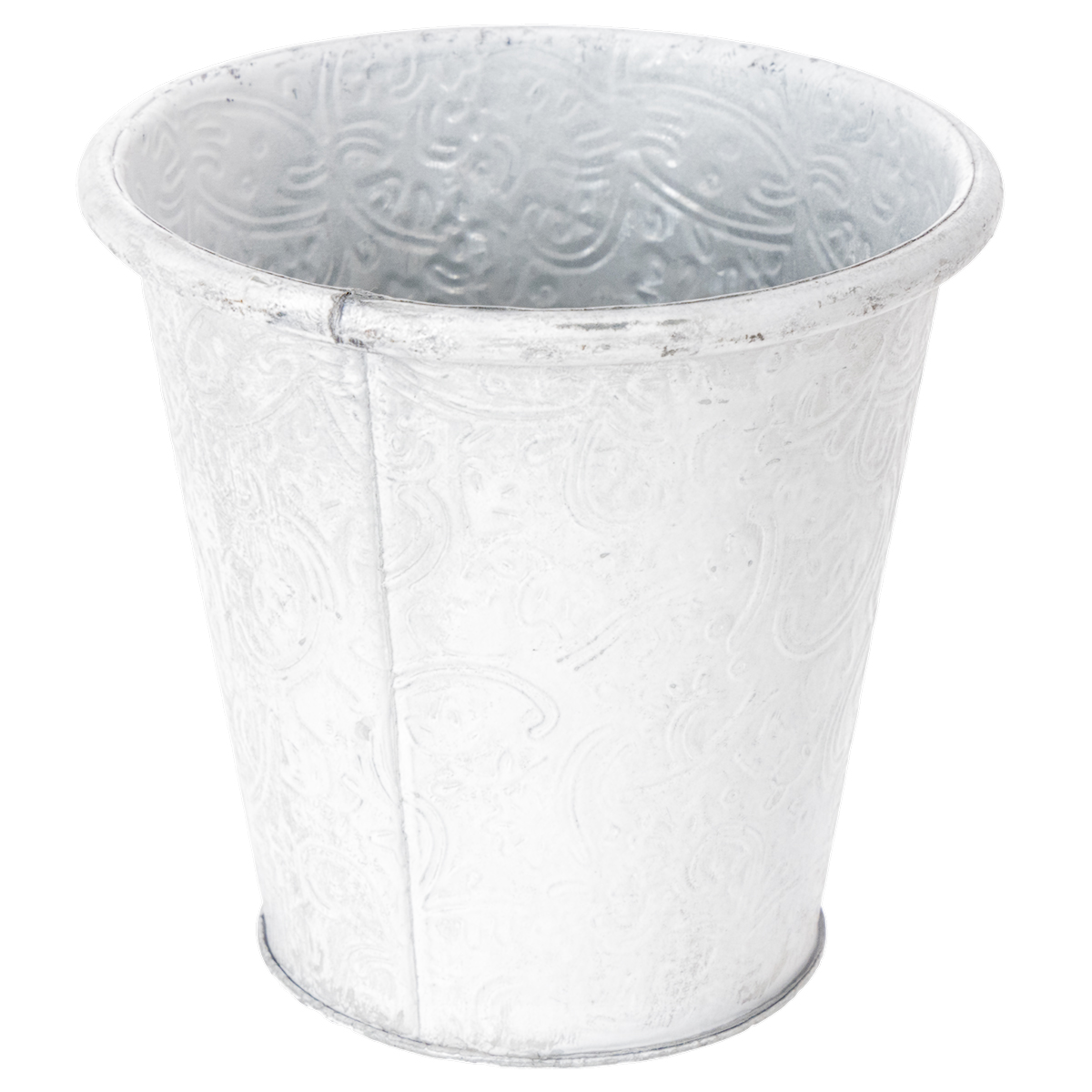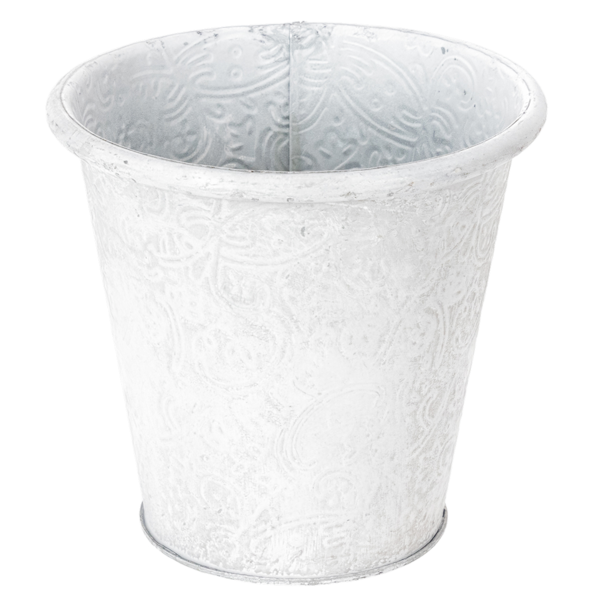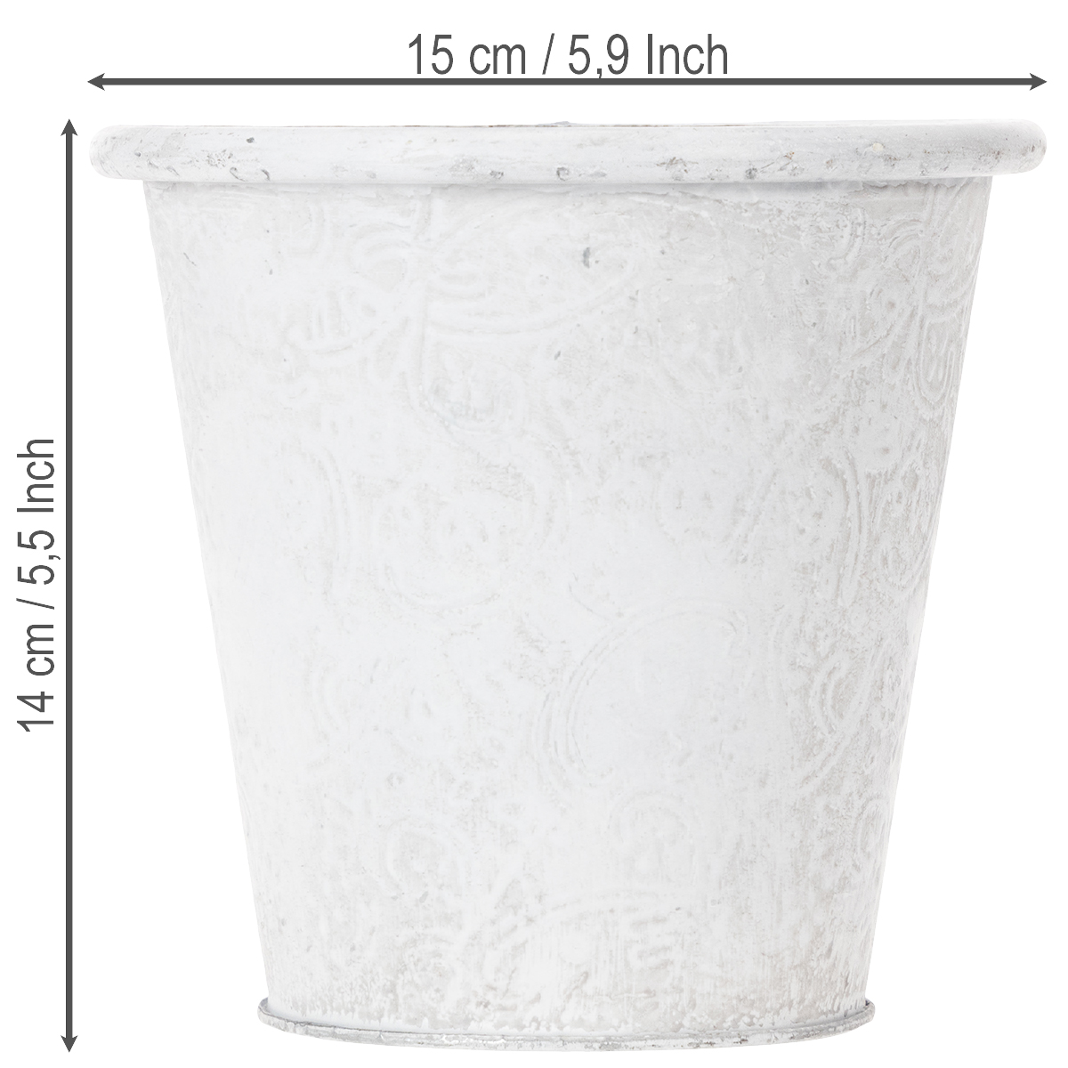 Dieser Pflanztopf mit geprägten Ornamenten in Weiß ist ein ganz wunderbarer Übertopf für Ihre liebsten Frühlingsblumen! Aber auch verschiedenste Utensilien, wie Stifte, Kosmetikpinsel und Bürsten oder kleine Gartenhelfer finden einen tollen Platz in diesem schönen Metallgefäß im angesagten Shabby Chic!