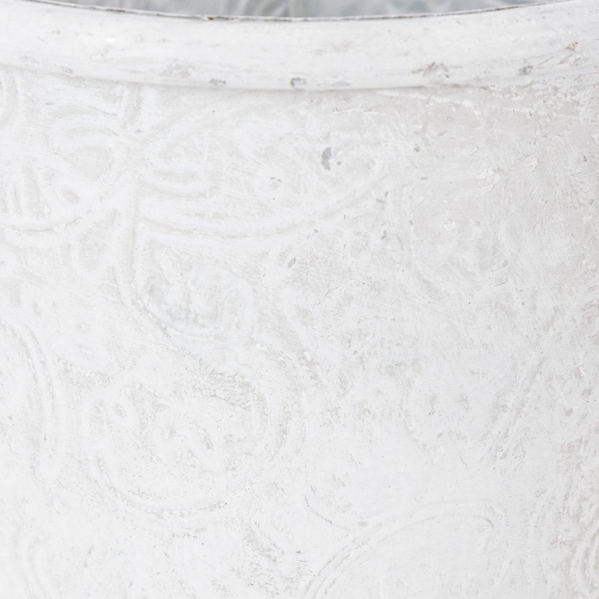 Deze witte bloempot met reliëf ornamenten in wit is een prachtige plantenpot voor je favoriete lentebloemen! Maar ook een grote verscheidenheid aan gebruiksvoorwerpen, zoals pennen, cosmetische penselen en borstels of kleine tuinhulpjes vinden een geweldige plek in dit prachtige metalen vat in trendy shabby chic!