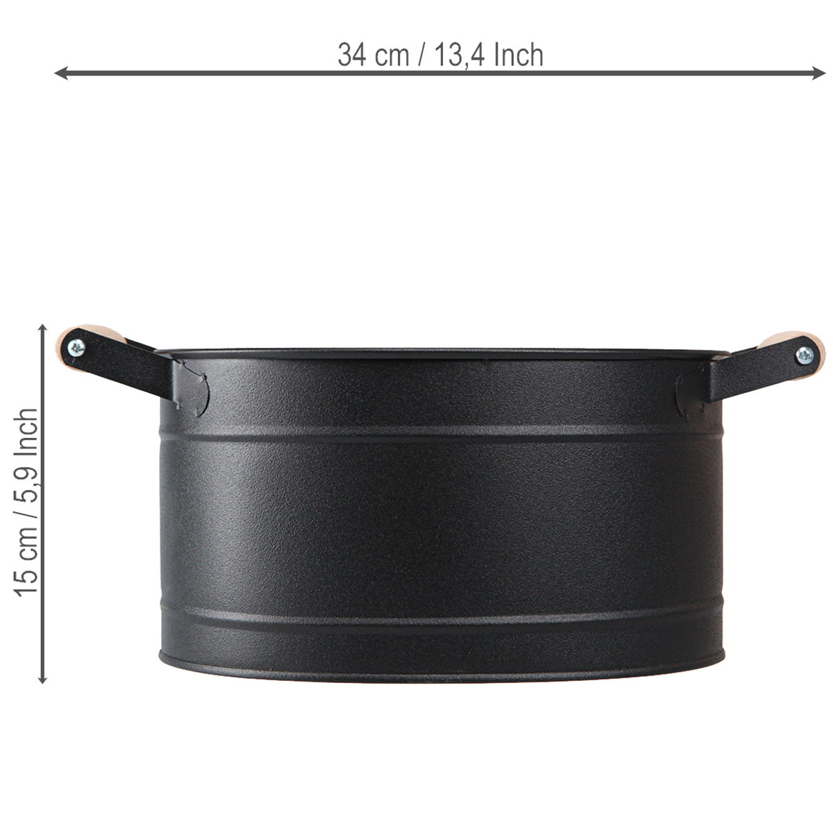 Entdecken Sie den zeitlosen Charme des Blumentopfs aus Metall in ovaler Form mit naturfarbenen Holzgriffen. Diese metallene Schale in elegantem Schwarz ist nicht nur funktional, sondern verleiht jedem Raum eine stilvolle Note. Ideal für Pflanzen oder als schicke Aufbewahrungslösung gefertigt, bringt diese Metall-Deko Eleganz in Ihr Zuhause.