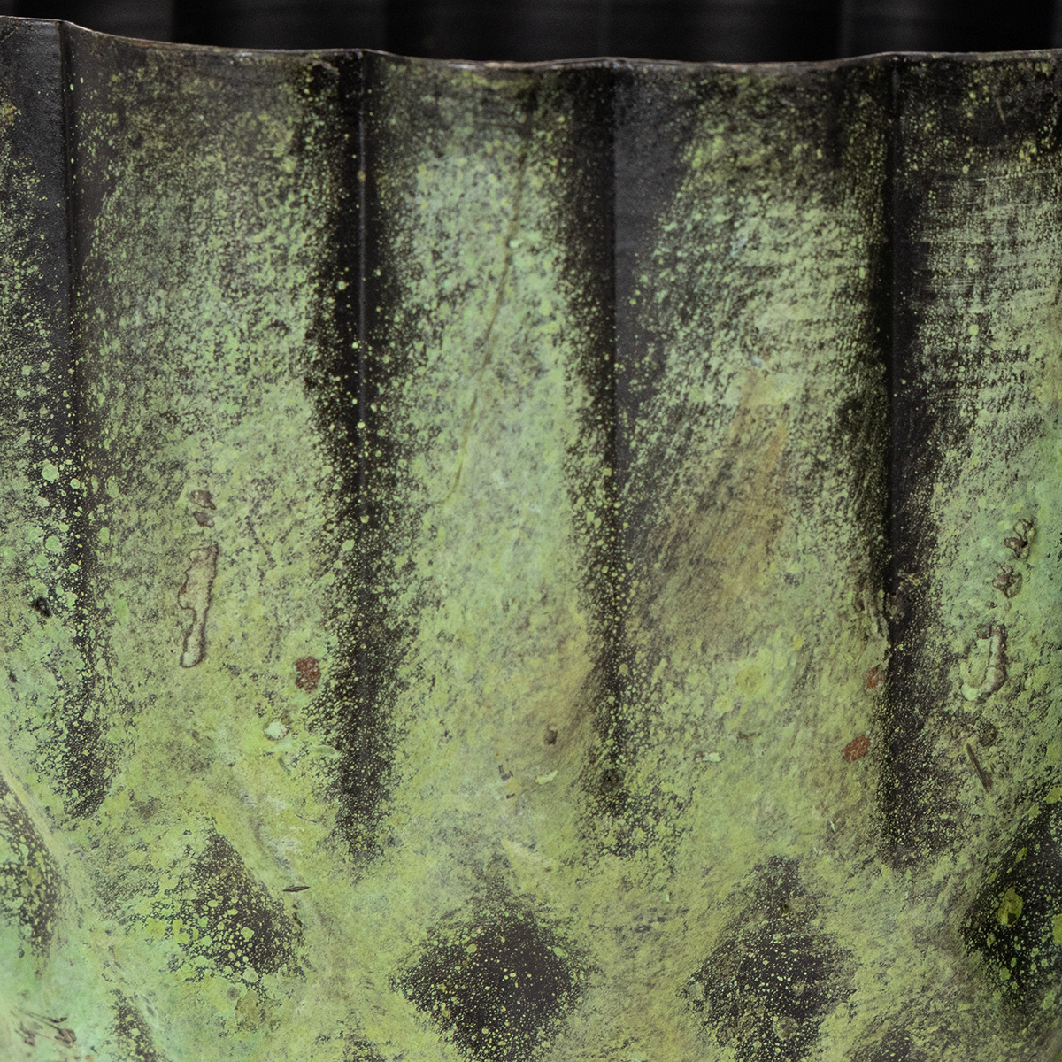 Cette jardinière en métal a un design élégant et une patine antique verte noble. Le pot de fleurs vintage est parfait pour vos plantes d'intérieur, vos herbes et vos arrangements décoratifs.