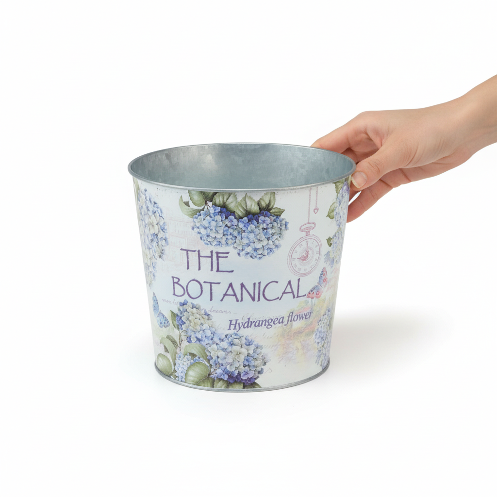 Cette jardinière en métal est pleine de romance estivale ! Les hortensias sur le pot de fleurs entourent les plantes et les fleurs avec la magie d'un jardin fleuri.