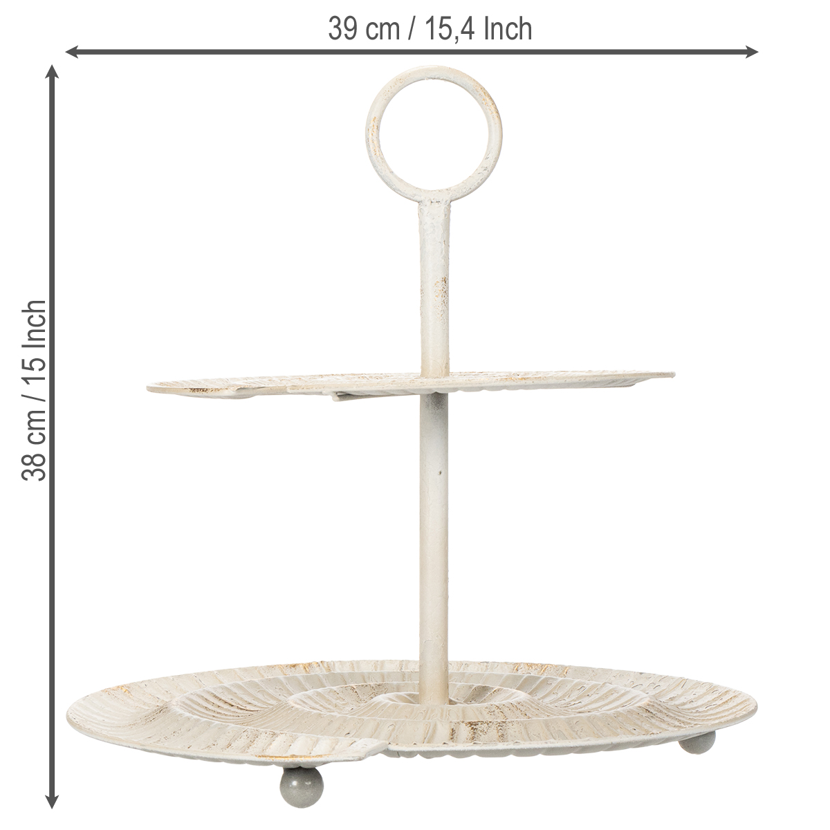Of het nu gaat om een ontspannen koffiemomentje, een feestelijke familiebijeenkomst of gewoon voor dagelijks gebruik – de juiste presentatie van desserts, gebak of kleine lekkernijen maakt een groot verschil. Met deze metalen dessertstandaard in een charmante vintage stijl brengt u niet alleen orde, maar ook elegantie op tafel. Deze standaard met twee etages imponeert met zijn gedetailleerde ontwerp en witte kleur, die prachtig past bij de shabby chic stijl. Een ware blikvanger voor de woonkamer of keuken!