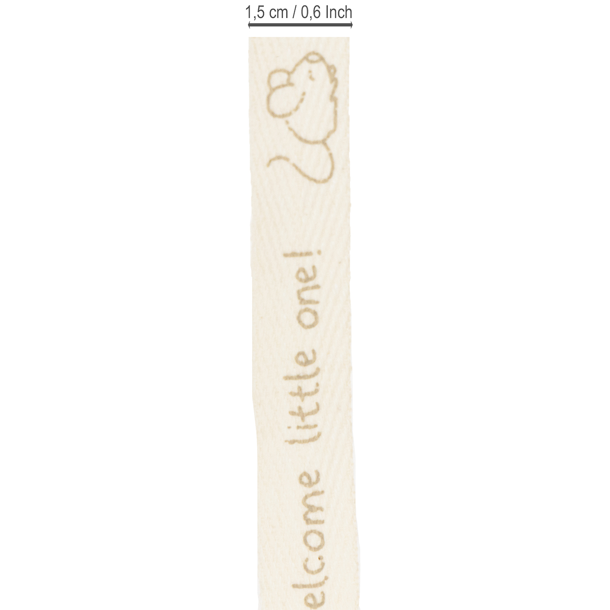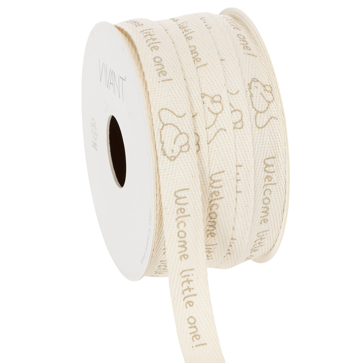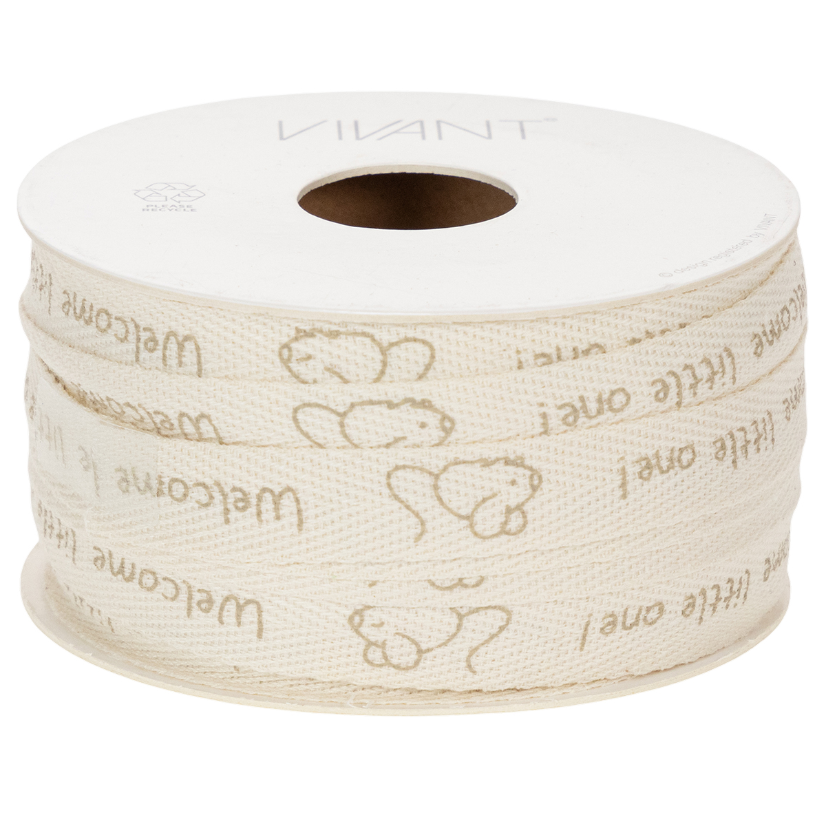 Des souris curieuses et le message « Bienvenue petit ! » sont imprimés en marron clair sur la bande crème en pur coton. Le ruban décoratif en coton, matériau naturel, est biodégradable et est présenté sur une bobine en carton pour plus de durabilité. Cela signifie que la décoration de baptême ne nécessite aucun plastique.