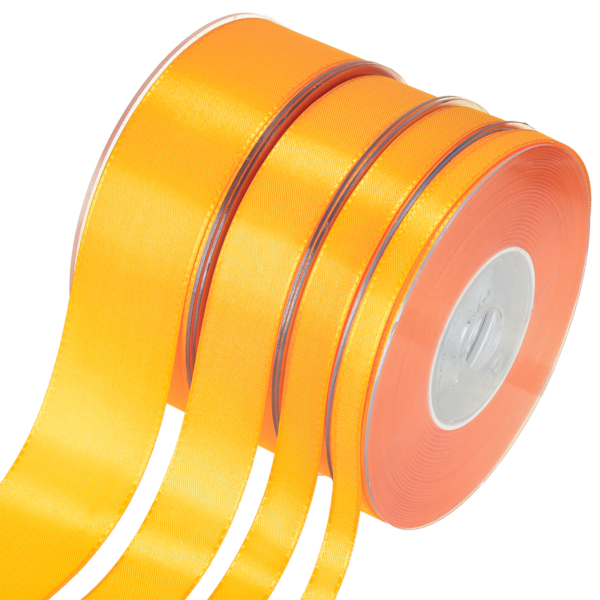 Het oranje geschenk- en decoratielint is op een plastic rol gewikkeld. Elke variant heeft een lengte van ongeveer 50 meter.