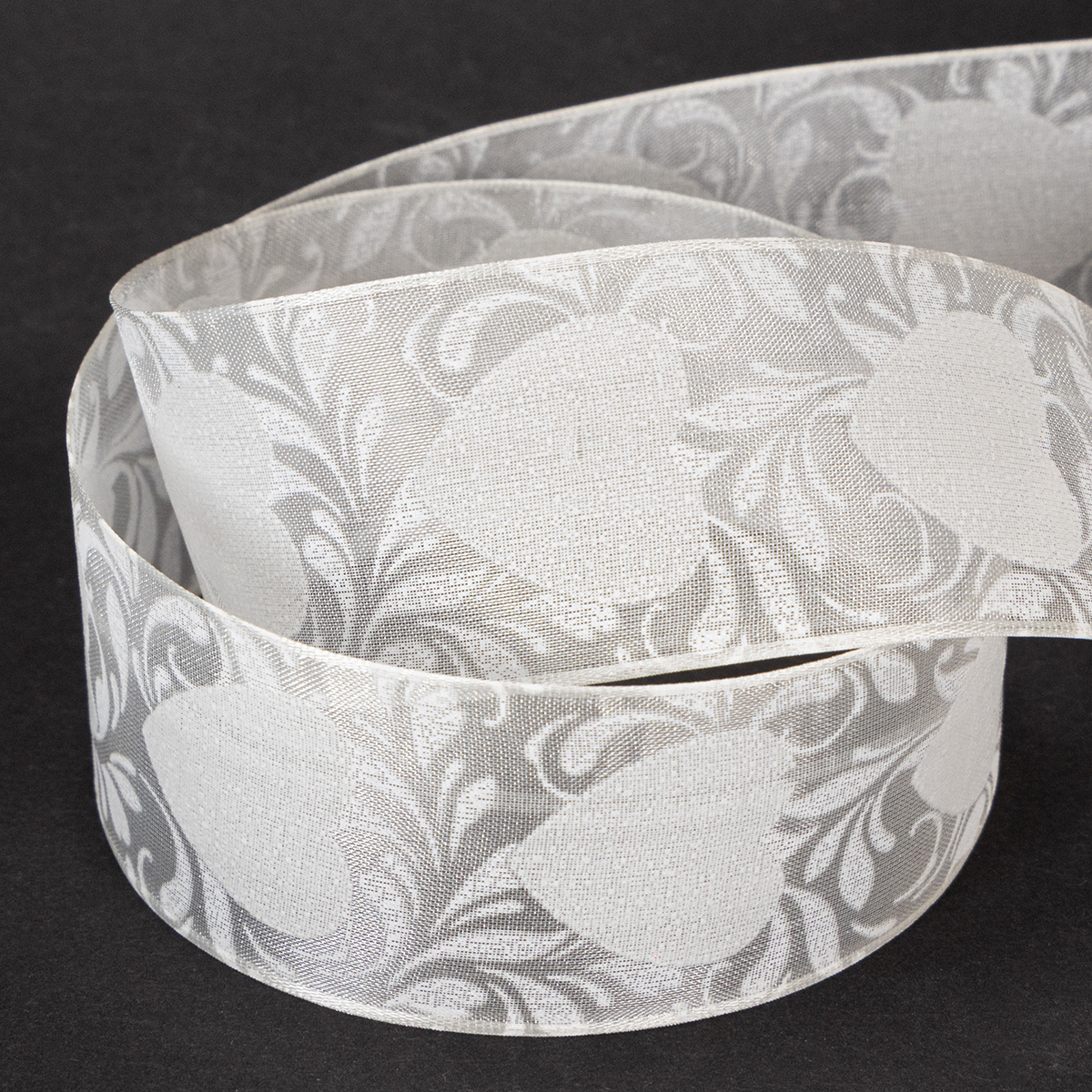 Les cœurs délicats sont entourés de branches feuillues comme des fleurs et imprimés sur le tissu organza transparent, donnant au ruban un aspect sophistiqué rappelant la dentelle. Le ton crème chaud du ruban décoratif est intemporel et transmet en même temps une certaine nostalgie.