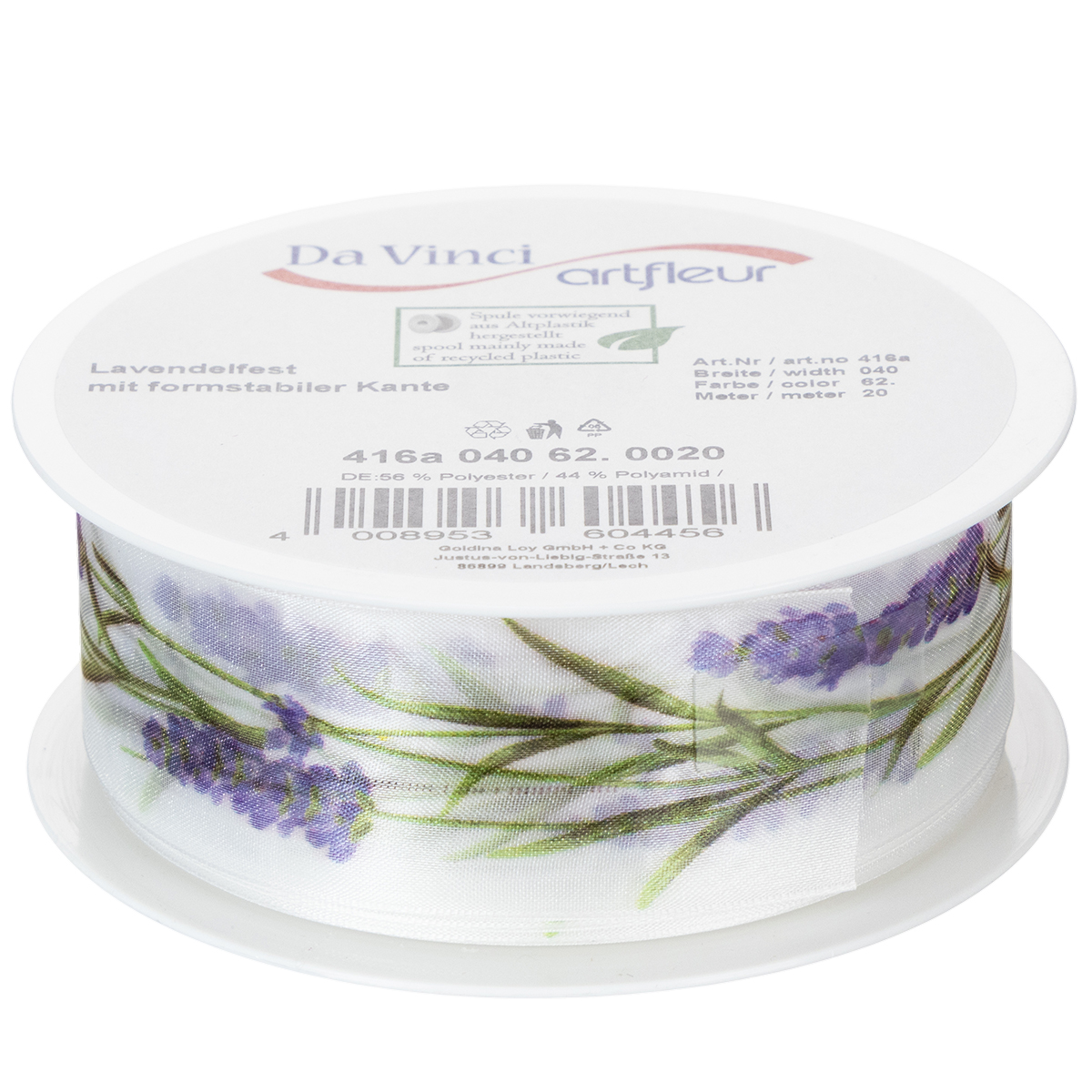 Het organzalint met lavendelmotief biedt een vleugje Provence voor zomerse decoraties en geschenken. Betover uw decoratie-ideeën met het glanzende chiffonlint!Het lavendelmotief ziet er fris en kleurrijk uit op de witte achtergrond van het organzalint. Het chiffonlint is door het transparante organzaweefsel licht en heeft een karakteristieke glans, terwijl de vormvaste randen ervoor zorgen dat strikken er schilderachtig uitzien.