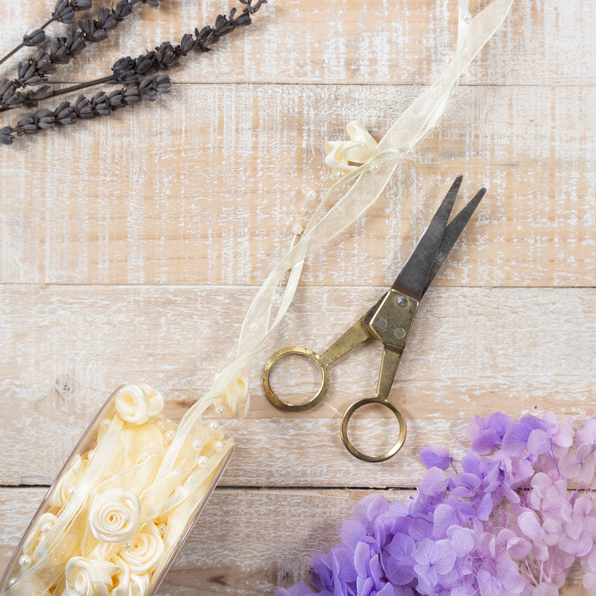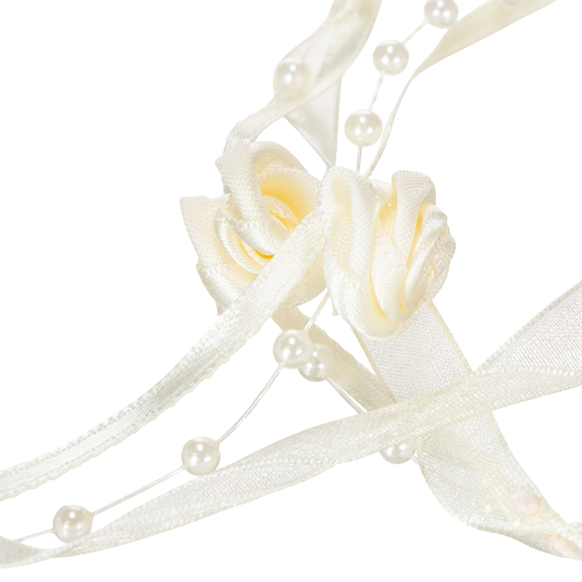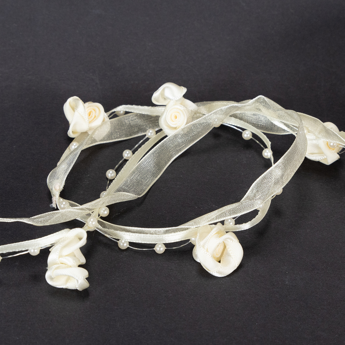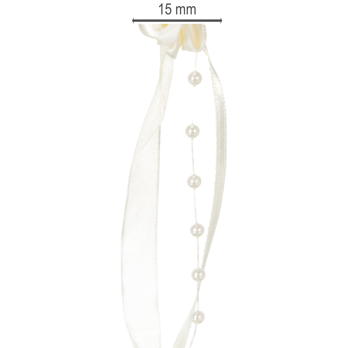 Das Schleifenband Valentino in Creme ist circa 5 Meter lang und etwa 15 Millimeter breit. Die Rosen haben einen Durchmesser von ungefähr 2 Zentimetern, während die Perlenköpfe einen Durchmesser von circa 0,4 Millimetern besitzen.