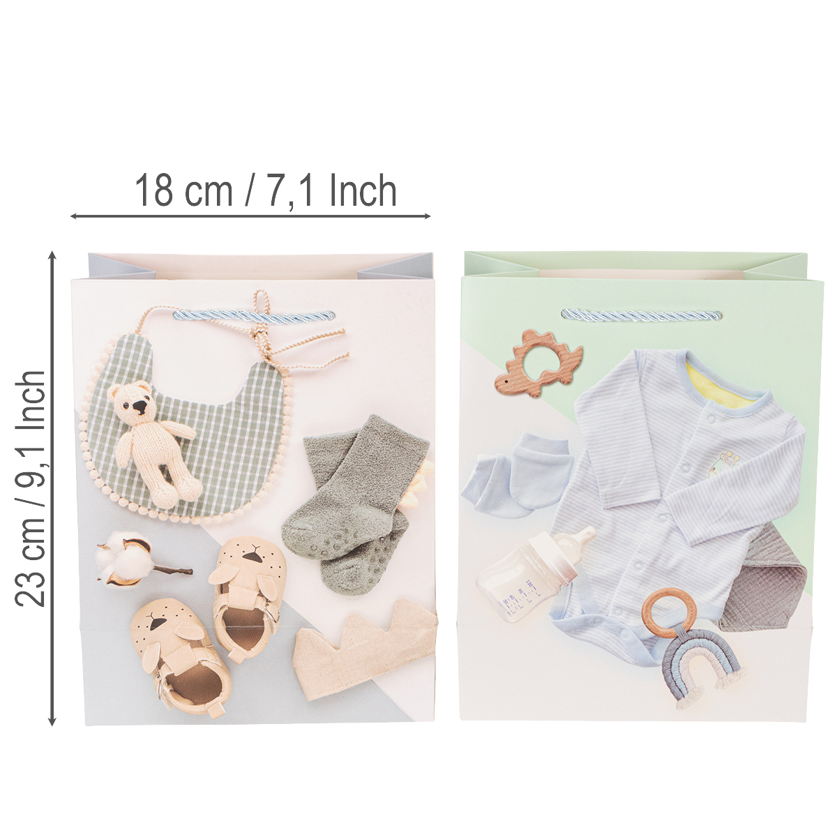 Suchen Sie nach einer stilvollen und praktischen Möglichkeit, Babygeschenke für einen Jungen liebevoll zu präsentieren? Diese bezaubernden Geschenktaschen für Jungen im praktischen 2er-Set setzen Ihr Geschenk perfekt in Szene – ganz gleich, ob für eine Babyshower, die Geburt oder ein herzerwärmendes Willkommensgeschenk. Hergestellt aus robustem Papier und mit einer Größe von etwa 23 Zentimetern, bieten diese Taschen ausreichend Platz für Kleidungsstücke, Spielzeuge oder andere kleine Aufmerksamkeiten. Sie sind die ideale Wahl für stilvolles und dennoch praktisches Verpacken.