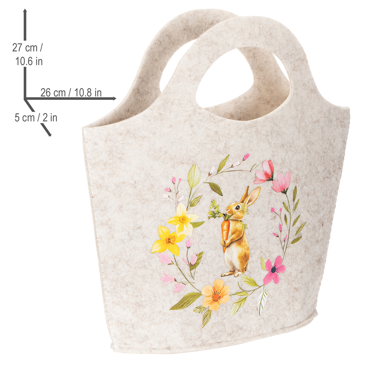 Met zijn harmonieuze bloemenpatronen en vrolijke konijntje is deze vilten tas niet alleen een blikvanger, maar ook ontzettend praktisch. Het eenvoudige, natuurlijke ontwerp in Scandinavische stijl is zowel modern als gezellig. Met een hoogte van 27 cm, een diameter van 26 cm en een breedte van 5 cm biedt de tas voldoende ruimte voor paaseieren, kleine cadeautjes of seizoensgebonden bloemstukken. De handige handvatten maken het de ideale metgezel, of het nu gaat om een picknick in de tuin, een paaseierenjacht of een bezoek aan de boerenmarkt.