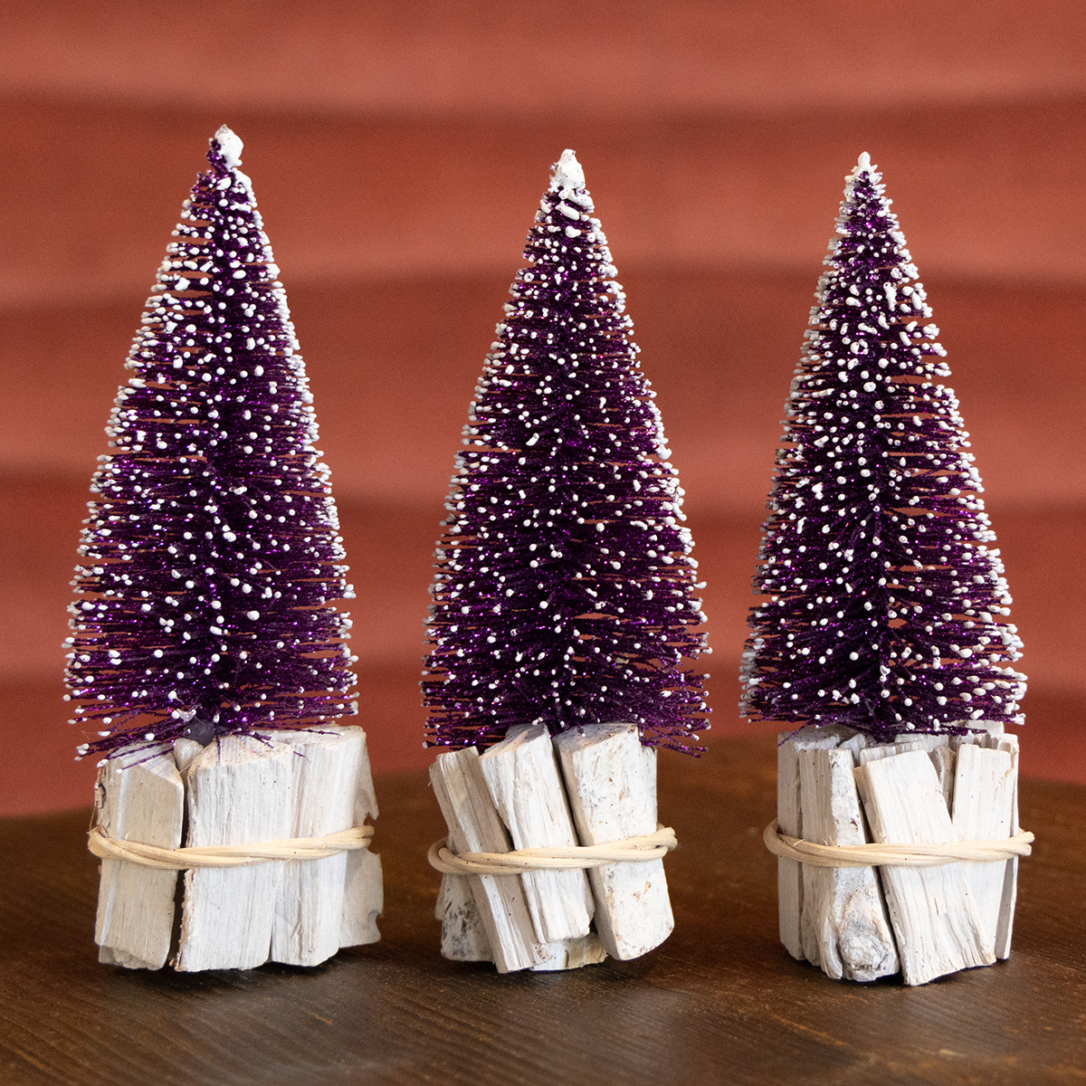 Sapin de Noël décoratif violet avec pointe de neige sur socle en bois rustique 15cm 3 pièces.