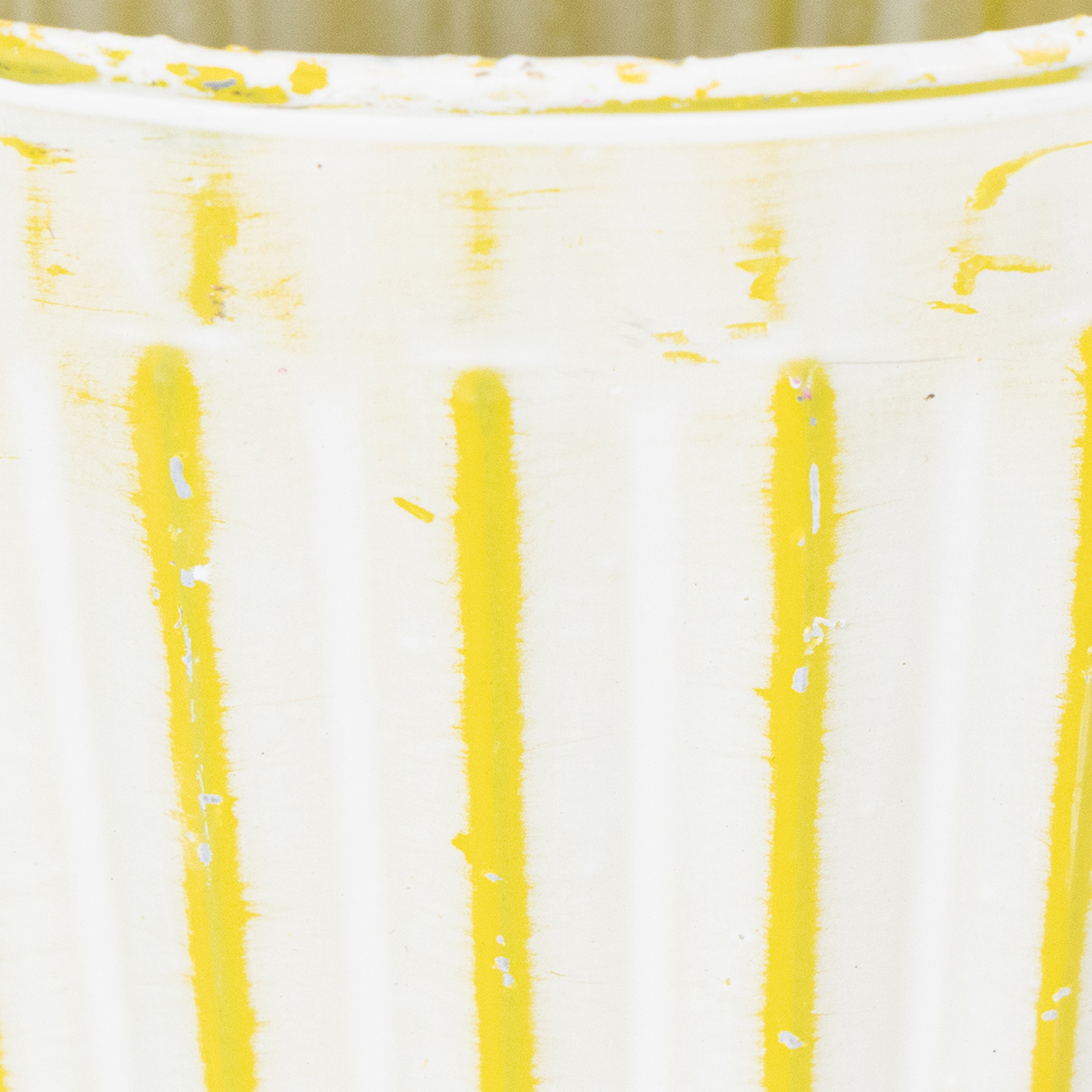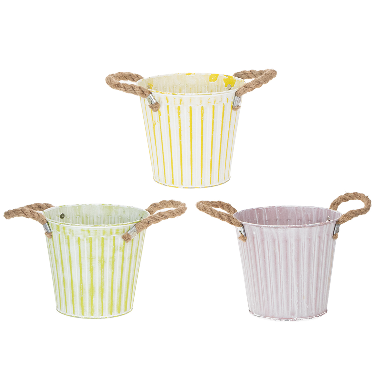 Les pots de fleurs ronds sont livrés dans un ensemble en rose pastel, vert et jaune et sont lavés en blanc shabby chic tendance. Un gaufrage vertical uniforme sur tout le pourtour donne au pot en métal un aspect moderne et graphique.