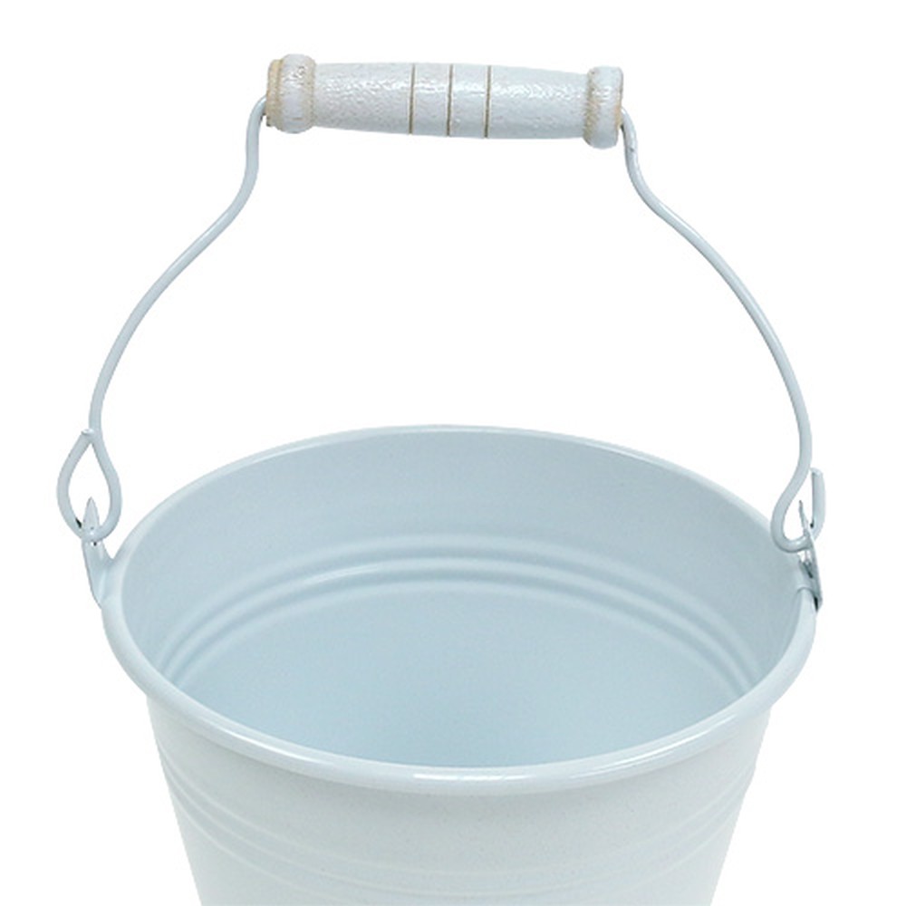 Dieser Metalleimer in Weiß kann sowohl als elegante Deko in ein Regal gestellt als auch als Übertopf verwendet werden! Der Blecheimer in Weiß besitzt sogar einen Henkel mit Holzgriff an der Oberseite und rundet dadurch das Bild perfekt ab. Sie können zum Beispiel Blumen wie eine kleine Rose, eine Tulpe oder eine Narzisse mit ihrem Topf in den Blecheimer stellen und diese dann ganz effektvoll auf ein Sideboard, eine Kommode oder einen Fenstersims stellen. Durch die weiße Farbe harmoniert der Eimer sehr schön mit einer modernen Innenausstattung und wirkt auch sehr elegant, wenn Sie einen Kaktus dort hineinstellen.Aber auch als praktischer Kräutertopf sieht dieser Blecheimer sehr schick aus: Stellen Sie einfach Petersilie, Basilikum und Schnittlauch in den Eimer und das Ganze dann auf ein Küchenregal oder auf den Fenstersims des Küchenfensters. Sie können die Pflanzeimer auch an Ihren Henkeln aufhängen und dort dann Kochlöffel, eine Knoblauchpresse und einen Schneebesen hineinstellen, um so in der Küche kreativ für Ordnung zu sorgen.