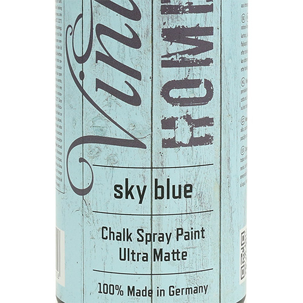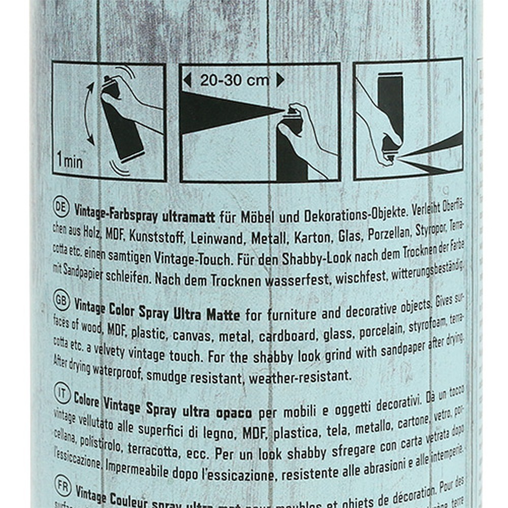 Dieses hellblaue Farbspray „Vintage“ erinnert an den schönsten Frühlings- oder Sommerhimmel und eignet sich so zur Umsetzung vieler kreativer Gestaltungs- und Dekoideen. Ob Sie die umweltfreundliche Sprühfarbe nun auf Leinwand, Metall, Holz, Porzellan oder Karton anwenden, spielt dabei keine Rolle – diese und noch viele andere Materialien sind mit dem Color-Spray kompatibel, sodass Ihrer Fantasie keinerlei Grenzen gesetzt sind!Da das Profispray nach dem Trocknen witterungsbeständig sowie wasser- und wischfest ist, können Sie damit beispielsweise eine alte Gartenbank im Shabby-Chic-Stil aufwerten: Schleifen Sie sie einfach mit Sandpapier, sobald die Farbe trocken ist, und verpassen Sie ihr – und allen anderen Möbelstücken, die Sie auf diese Weise bearbeiten – einen samtigen Vintage-Touch! Ebenso lassen sich Gestecke und Trockenkränze ganz oder teilweise mit der Sprühfarbe einfärben, Terrakotta-Blumentöpfe und Glasvasen verschönern oder auch – zum Beispiel für den Fasching – Haarreifen und andere Accessoires aufpeppen. Die Möglichkeiten sind endlos!