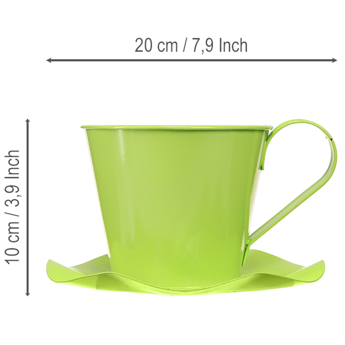 Setzen Sie mit unserer Deko-Tasse aus Metall im hellen Apfelgrün einen frischen und lebendigen Akzent in Ihren Räumlichkeiten. Diese Deko-Teetasse kombiniert klassisches Design mit modernen Akzenten und bietet Ihnen unendlich viele Möglichkeiten zur kreativen Gestaltung. Die hellgrüne Metalltasse ist auf einem blütenförmigen Unterteller fixiert und besticht durch ihren eleganten Look. Mit einem Durchmesser von etwa 12 Zentimetern für die Tasse und circa 18 Zentimetern für den Unterteller sowie der Höhe von ungefähr 10cm ist sie perfekt für verschiedenste dekorative Einsatzmöglichkeiten geeignet. Ob für die Aufbewahrung von Kleinigkeiten, als stilvolle Tischdekoration für besondere Anlässe oder als Mini-Blumentopf für Ihre Lieblingspflanzen – die Verwendungsmöglichkeiten sind vielfältig. Entdecken Sie die Freude an der Dekoration mit dieser bezaubernden Metall-Teetasse, die jedem Ort eine besondere Note verleiht.