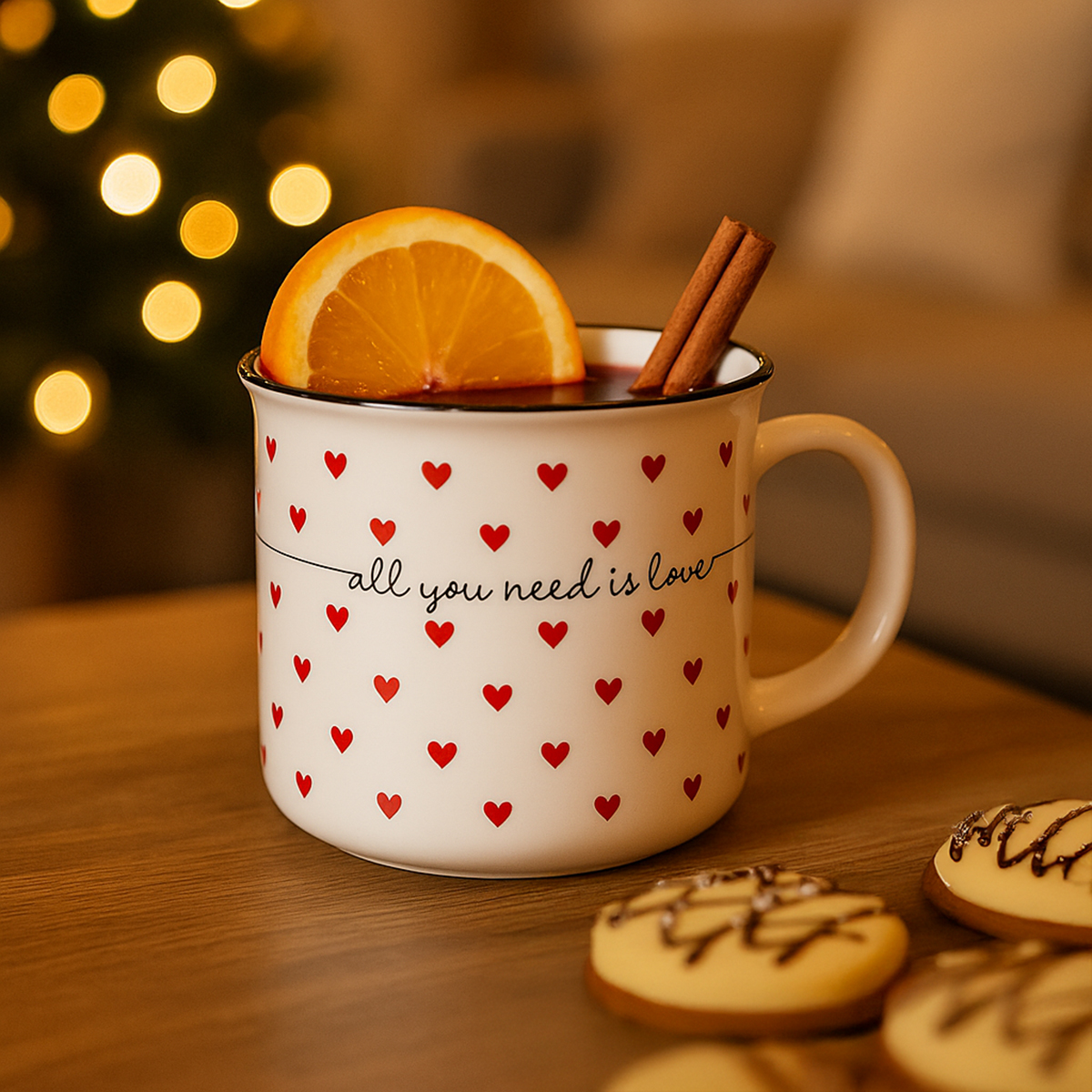 Diese Tasse mit Herzen ist mehr als nur ein Behälter für dein Lieblingsgetränk. Mit ihrem charmanten Design – weißer Hintergrund, kleine rote Herzen und die Aufschrift „All you need is love“ – zaubert sie garantiert ein Lächeln auf Ihr Gesicht. Der feine schwarze Rand setzt einen eleganten Akzent und ergänzt die rote Farbgebung perfekt. Der Henkel bietet eine angenehme Handhabung, während die Keramik eine robuste und hochwertige Qualität verspricht. Ideal für den Einsatz im Büro oder für eine liebevolle Frühstücksüberraschung für Ihren Schatz. Wer skandinavischen Stil mag, wird sich in diesen Mix aus Schlichtheit und Romantik verlieben. Kombinieren Sie die Tasse doch mit unseren weiß-roten Servietten oder einem dekorativen künstlichen Rosenstrauß von Floristik24! Sie werden sehen: Diese Tasse passt sowohl in minimalistische als auch in gemütliche Landhaus-Küchen und bringt überall ein Stück Romantik mit sich.